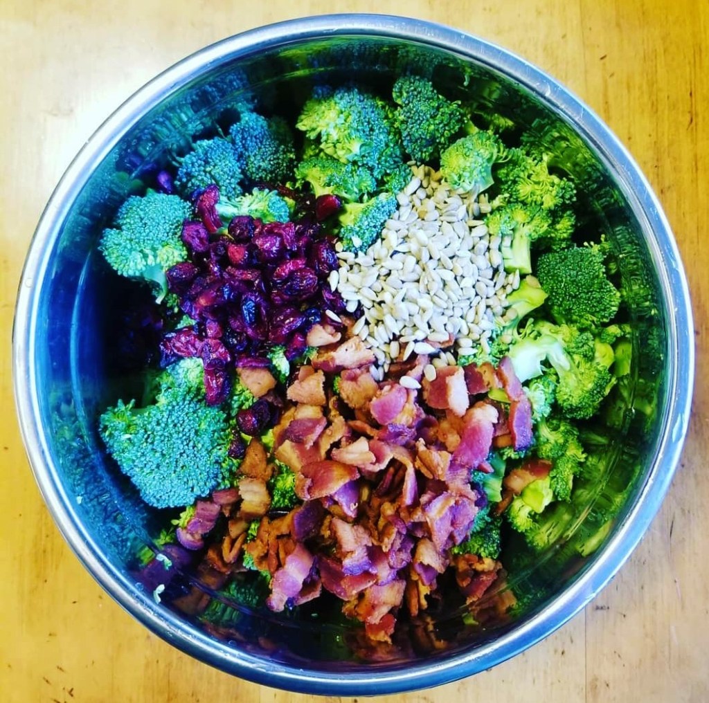 - Dressing – 3/4 cup olive oil, 2 Tbsp honey, 2 tsp Nature’s Seasons – whisked