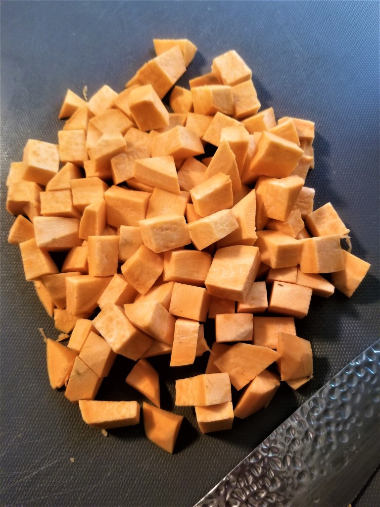 - 2 sweet potatoes – medium sized – peeled and diced into 1/2 inch cubes
