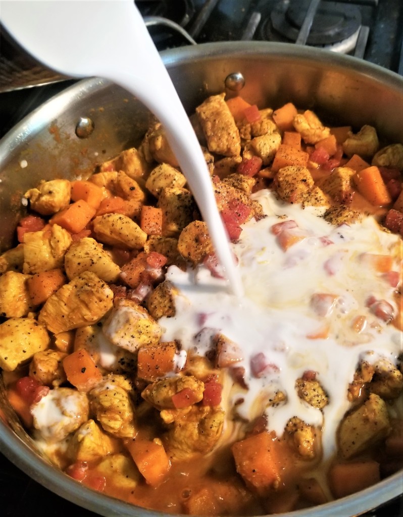 Slice sweet potatoes into 1/2 inch cubes. Slice chicken breasts into bite sized pieces. Add 1 Tbsp. olive oil into large skillet and heat on medium. Add sweet potato and chicken to pan. Mix all seasonings and sprinkle evenly over chicken and potatoes. Stir lightly until chicken appears cooked on all sides and sweet potato begins to soften. (Don’t worry about making sure your chicken is cooked through. It will finish cooking after liquids are added.)