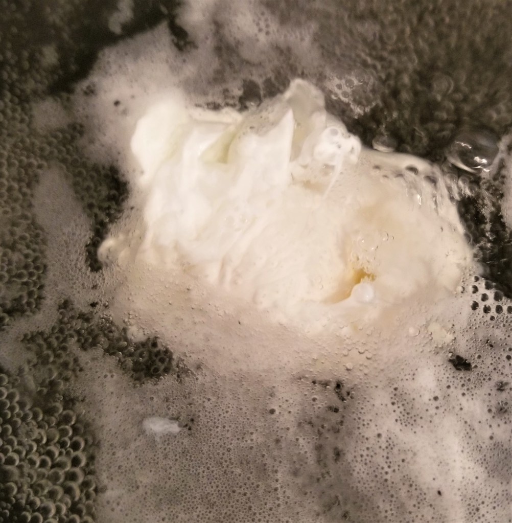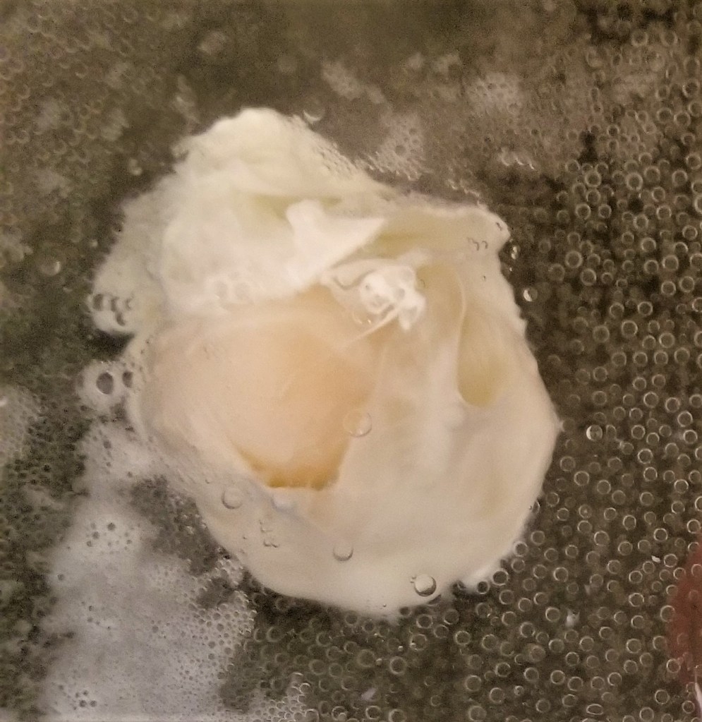 Gently pour your egg into the simmering water and vinegar. Repeat with your other eggs, keeping track of which egg went in first. (I use the clockwise method, starting at 12 and working my way around the pan.)