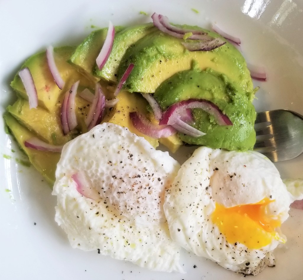 Plate with your favorite accoutrements. Today I used avocado, with a squeeze of lemon, and purple onion. I topped everything with salt and pepper. Enjoy!