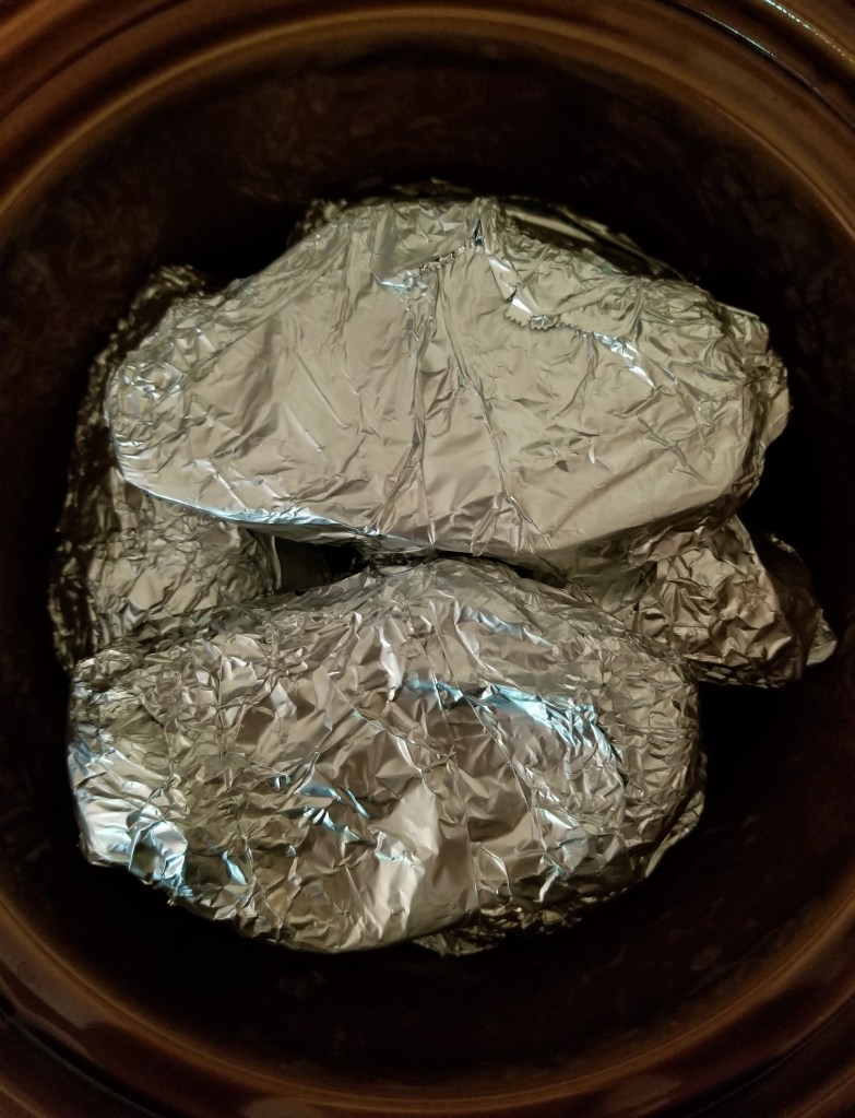 Wrap tightly in aluminum foil, alternating directions of wrapping between the two pieces of foil. This helps keep all the moisture inside. Place in your crock pot, on high, for 4-5 hours. I also normally rotate them half way through to make sure they cook evenly, but my crock pot is older than I am.