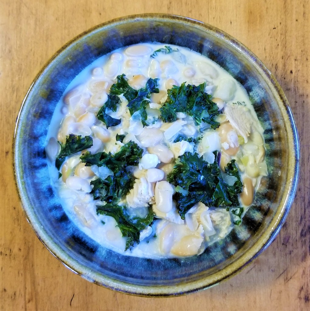 Drain and rinse all beans and add to the pot. Drain hominy and add as well. Add salsa verde and green chiles, chopped onion, garlic, half the cumin, white pepper, and Nature’s Seasons. Let simmer for 30 minutes. Add the heavy cream and bring back to a simmer. TASTE! This is when I added the other half of the cumin, white pepper, and Nature’s. Wash and tear kale into bite sized pieces, then add to the pot. Let the entire pot simmer for 10-15 minutes.