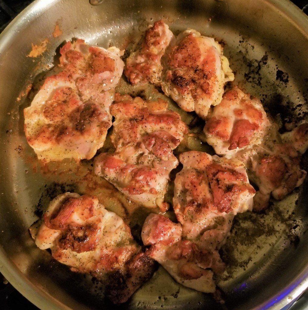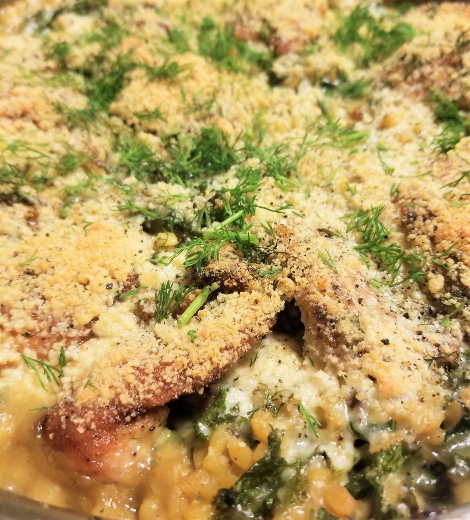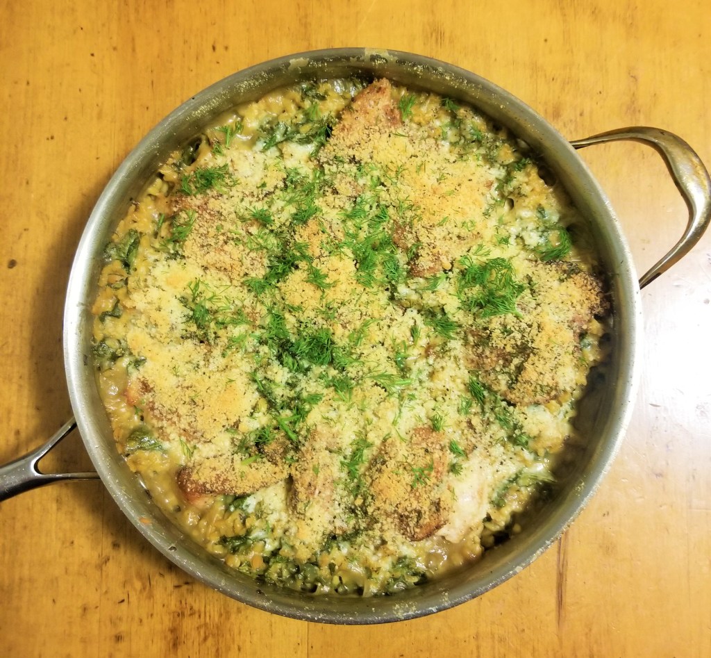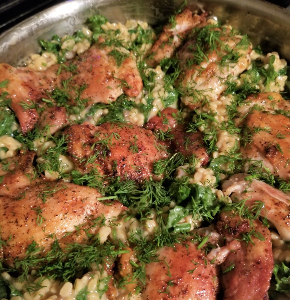 Boil orzo to package directions. Tear and wash kale. Meanwhile, heat one tablespoon olive oil in a large, oven safe pan. Season the chicken thighs on both sides with Nature’s Seasons. Sear until golden and starting to crisp on both side and set aside. Deglaze the bottom of the pan with a splash of white wine. Combine the remaining wine with three cans of cream of mushroom soup. In the pan, combine orzo, kale, and cream of mushroom soup mixture until mixed thoroughly. Nestle the chicken into the orzo, top with half the fresh dill and parmesan cheese.