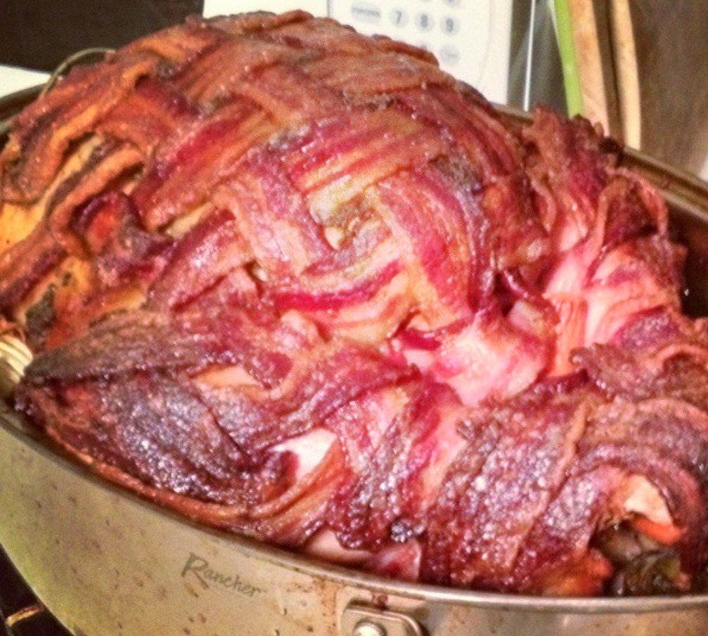 ***Warning: this may not be the prettiest bird ever, and I suggest you serve it carved. If you want a nice presentation, leave the bacon on the turkey when you take it to the table.***