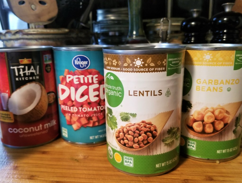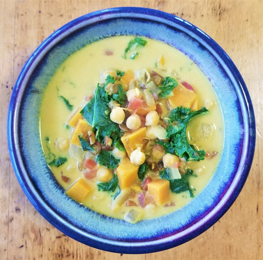 Add seasonings – curry, turmeric, graham marsala, brown sugar, and salt. Drain the garbanzo beans and lentils and add to the pot. Bring to a simmer again. Add two cans of coconut milk and stir until well combined. Taste! This is the point to adjust your seasonings.
