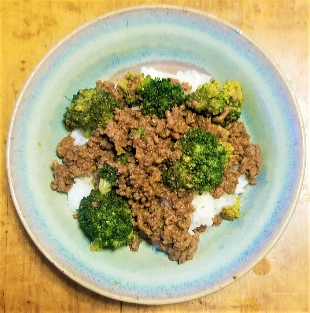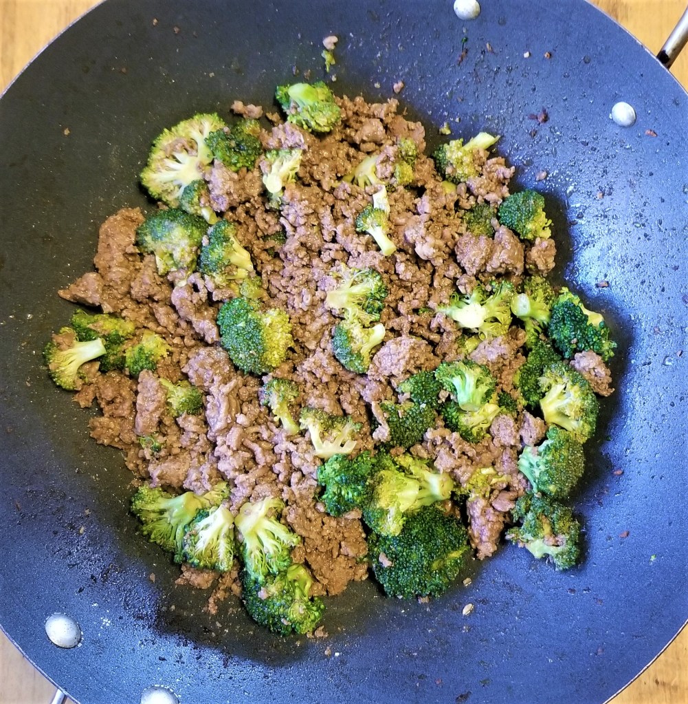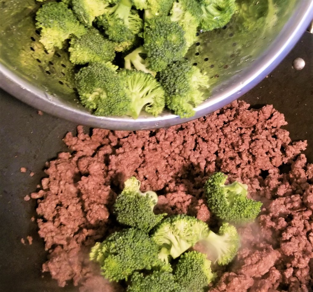 Brown the ground beef until starting to get crispy. Drain additional fat and moisture. Wash and chop broccoli into bite sized pieces. When the beef is done, add the broccoli and sauté for 5 minutes. (I prefer my broccoli to have a bit of a crunch to it still. If you want it softer, cook to your preferred doneness.)
