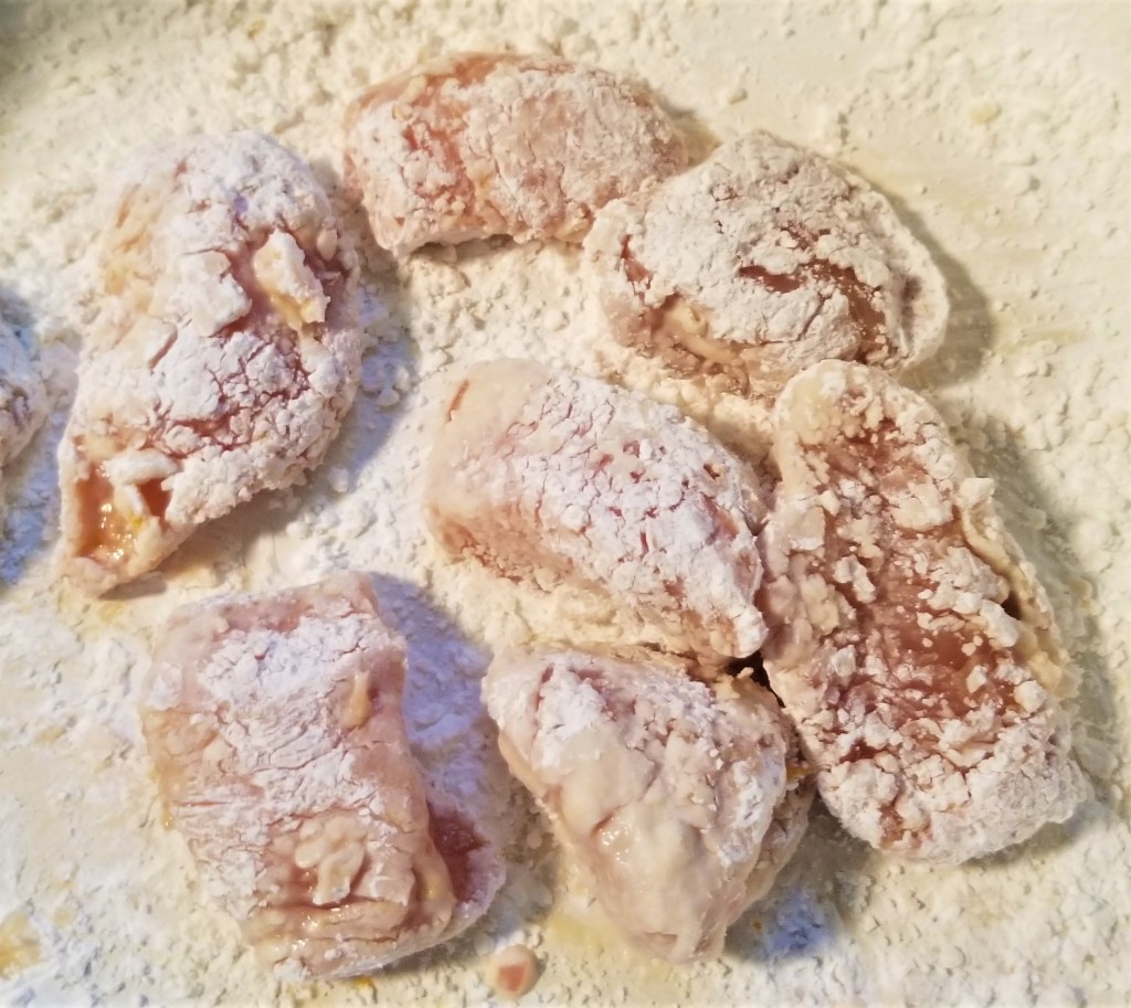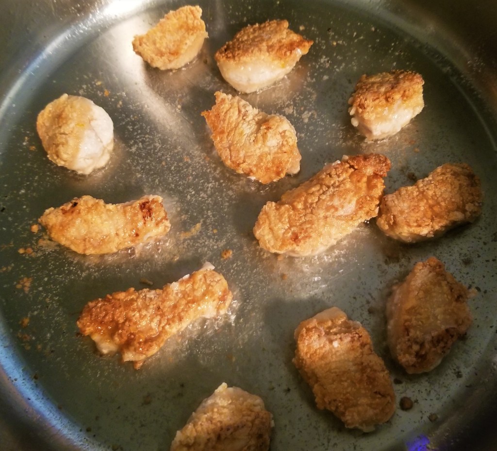 Toss the chicken in corn starch. I like to do this in batches so it doesn’t get soggy. Fry in vegetable oil until golden brown on all sides. Don’t overcrowd the pan! Remove to a parchment lined cookie sheet to drain and continue until all chicken is cooked.