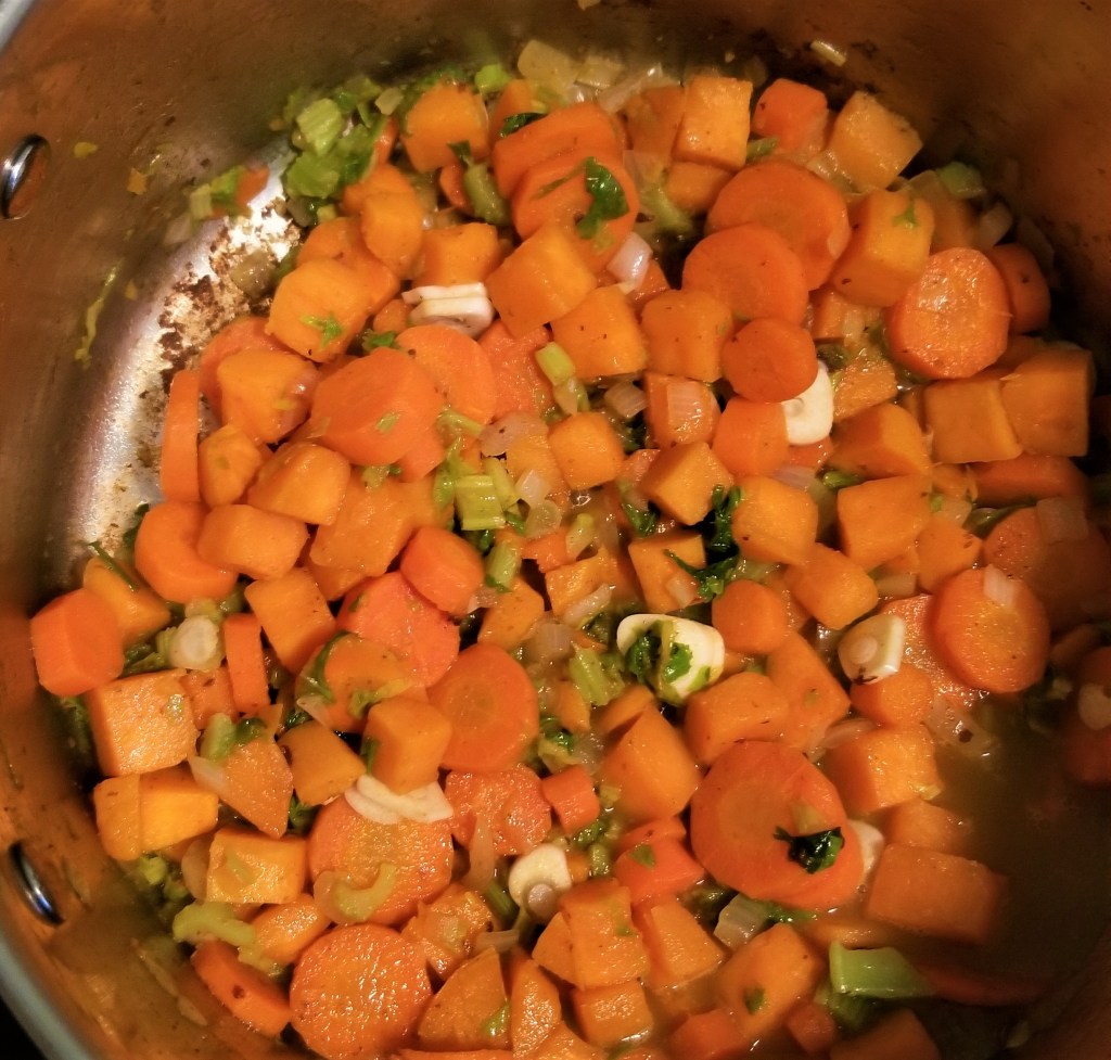 Slice and brown the bacon until crispy. Remove to a bowl. Peel and chop sweet potato and carrots. Add to the bacon fat and stir around until well coated. Chop onion and garlic and add to the pan. Add celery. Stirring frequently, let cook for 5 minutes.