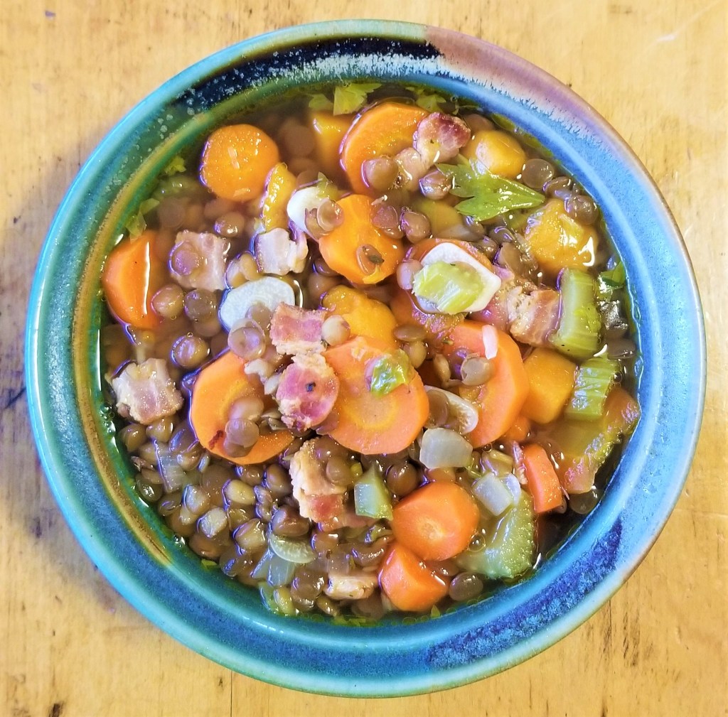 Add beef broth and bring to a simmer. Season with first half of Nature’s Seasons. Let cook until the potatoes and carrots are tender. Add water. Drain and rinse lentils and add to the pot. TASTE! Add remaining Nature’s as needed. Add oregano. Bring to a low boil and let cook for another 5 minutes. Add cooked bacon back to the pot. Serve with cornbread!
