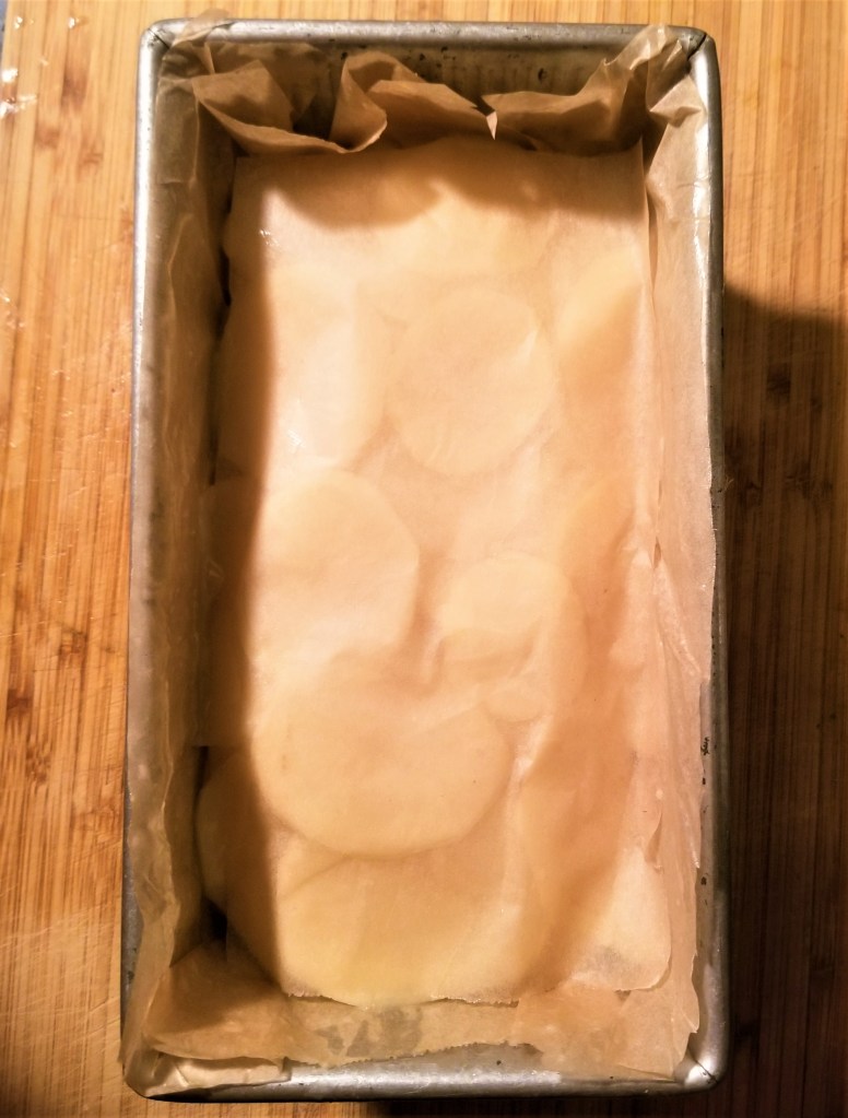Peel and thinly slice the potatoes. Toss in melted duck fat and salt. Line one of the loaf pans with parchment paper. Layer the potato slices evenly. Place another piece of parchment paper on top. Bake for three hours in a 300 degree oven until knife tender.