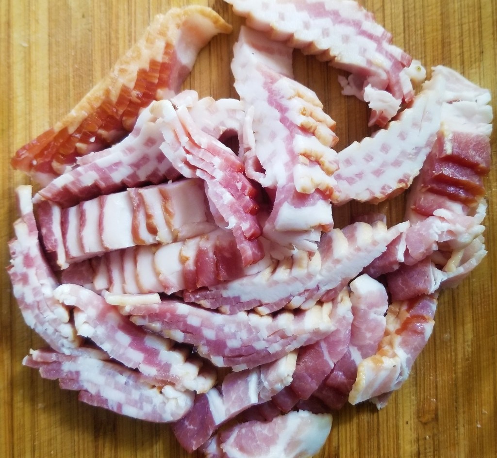 Slice the bacon and add it to the pan. Add turmeric, oregano, and pepper. Continue stirring around until the potatoes are mostly done and your bacon is at least half way crisp.