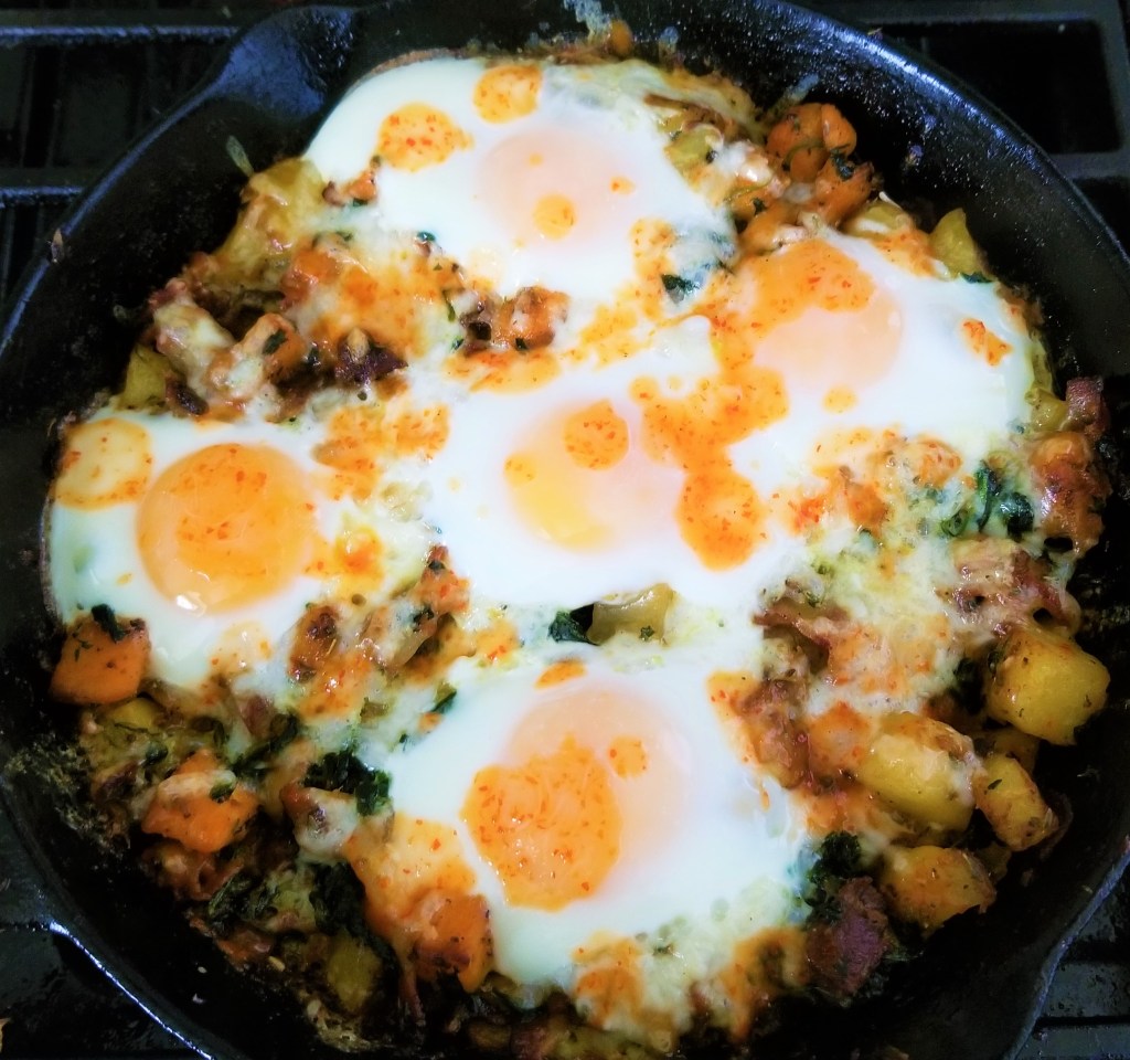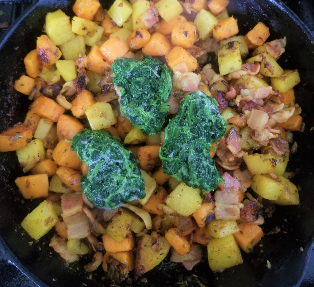 Peel and chop potatoes into cubes. Warm olive oil in a cast iron skillet and throw the sweet potatoes in first (they take a little longer). Add the Yukon gold potatoes and onion to the pan. Stir regularly until the onions become translucent.