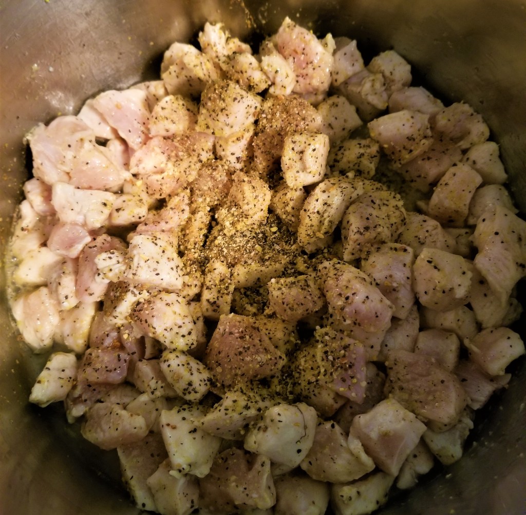 Dice chicken into bite sized pieces. In a large soup pot, warm vegetable oil and add chicken. Season with two tablespoons of lemon pepper. Cook until starting to brown.