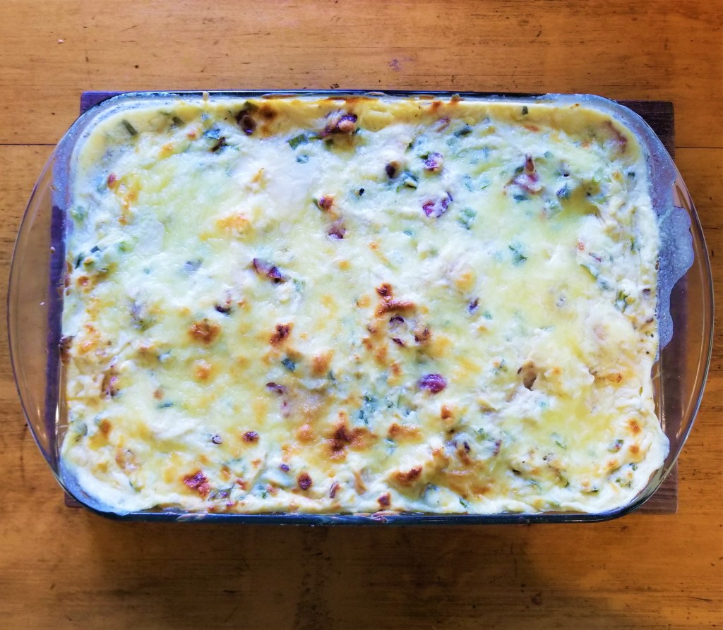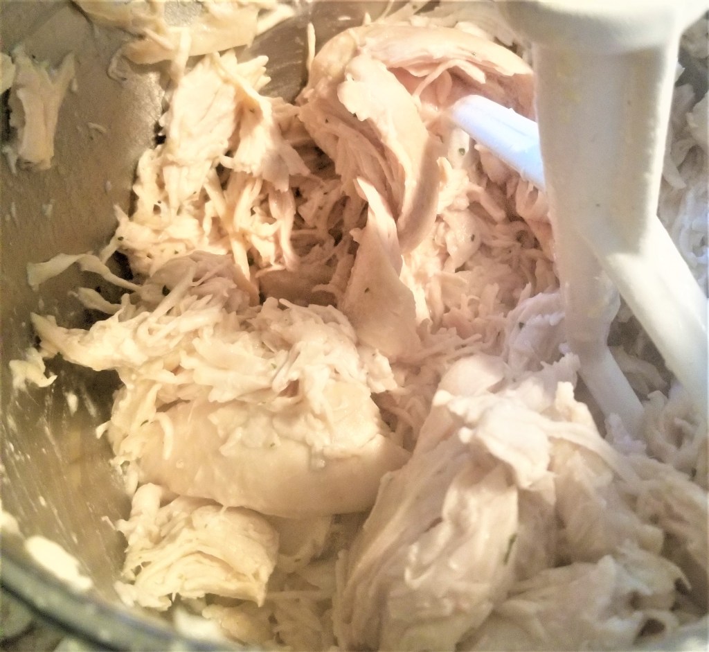 Season chicken breasts with garlic salt on all sides and bake in a 350 degree oven for 40 minutes. Place cooked chicken breasts in a stand mixer and, using the flat beater attachment, shred the chicken. (I had never tried this technique before today, but it really works! I’ll never waste time shredding chicken with two forks or a knife again.) Remove any remaining liquid from the casserole dish and place shredded chicken back in.