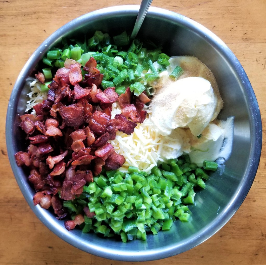 Cook bacon until crispy and set aside to cool. Seed and chop jalapenos and chop the green onions. Combine sour cream, softened cream cheese, cooled bacon, chopped jalapenos and green onions, and 3/4 of the Monterey jack cheese. Add garlic powder and white pepper.