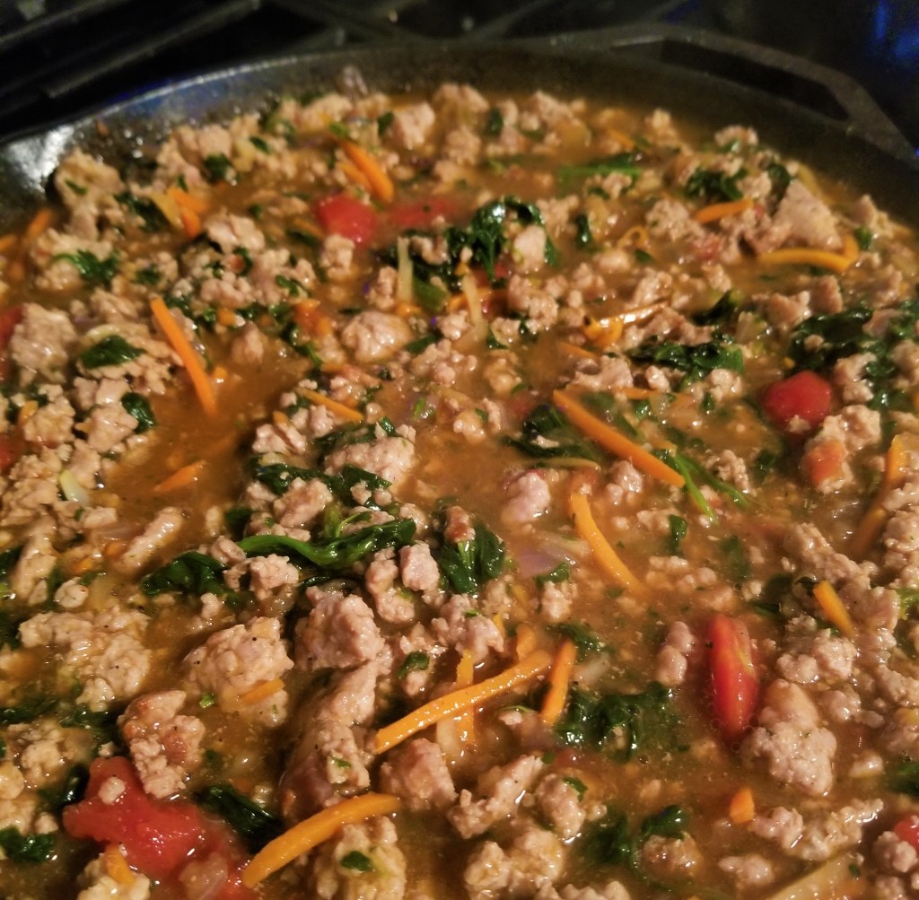In a large skillet, brown the ground pork and onion. Season with garlic salt. Brown until a crisp starts to form on some of the pork. Sprinkle with corn starch. (The corn starch acts as a thickener and is the gluten free replacement for adding flour.) Add the canned tomatoes, frozen butternut squash, shredded carrots, and frozen spinach.