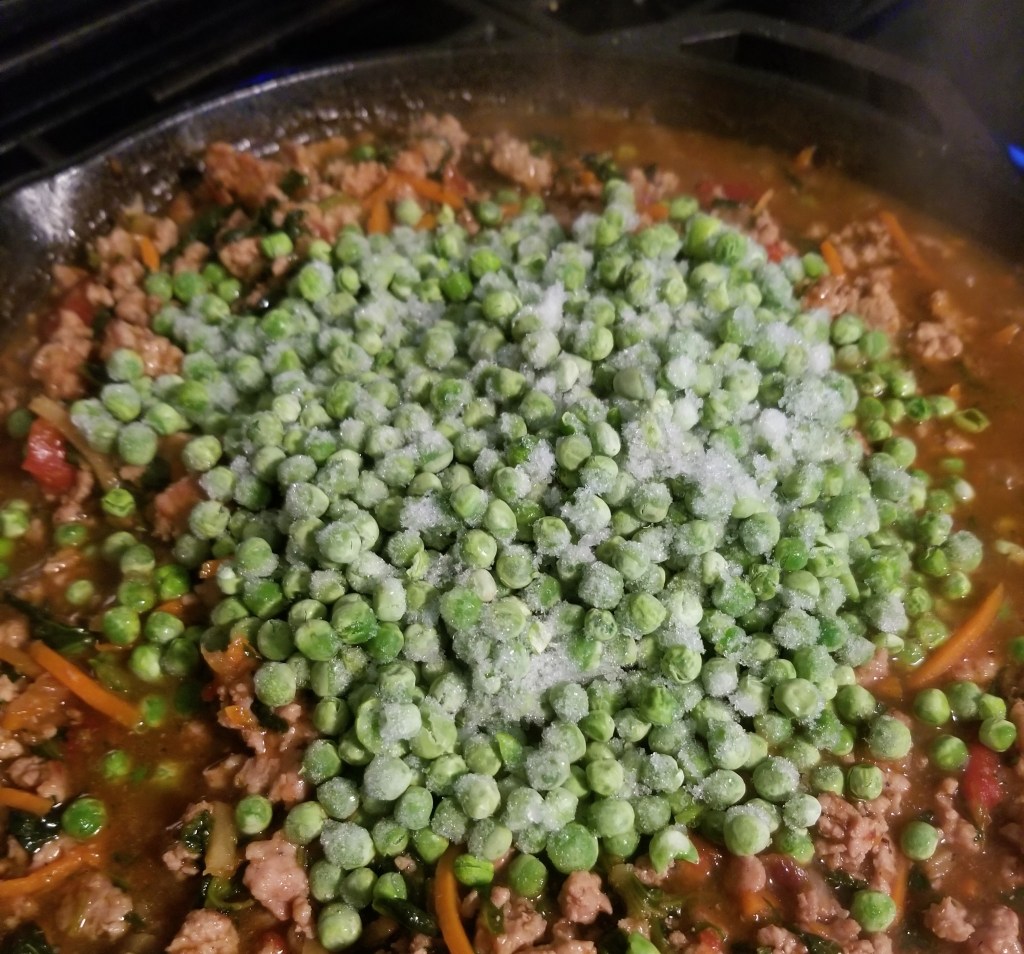 Add frozen peas and stir in. Taste! This is your opportunity to adjust seasoning. Remove from heat and let cool for 20 minutes.