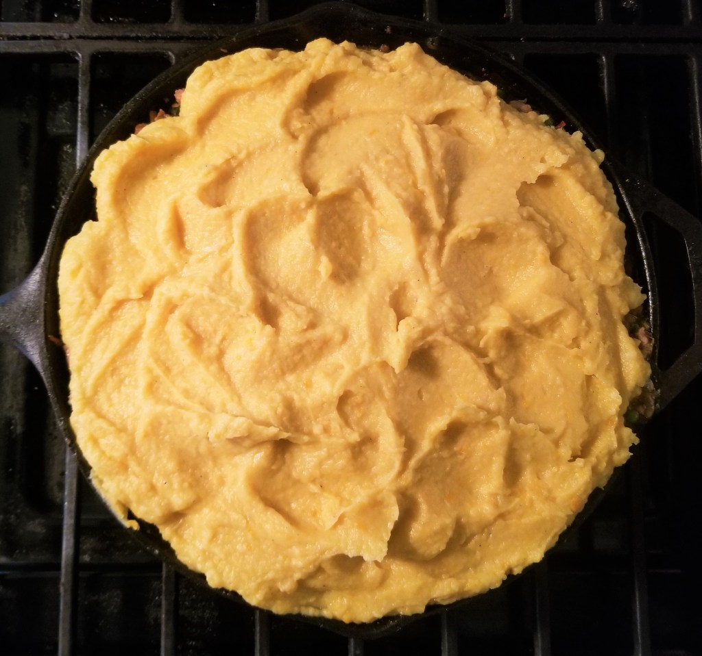 Once the meat and vegetables have cooled down and set a bit, spoon the potatoes on top. You can pipe them on if you’re feeling fancy or make a pattern, I just used spatula.