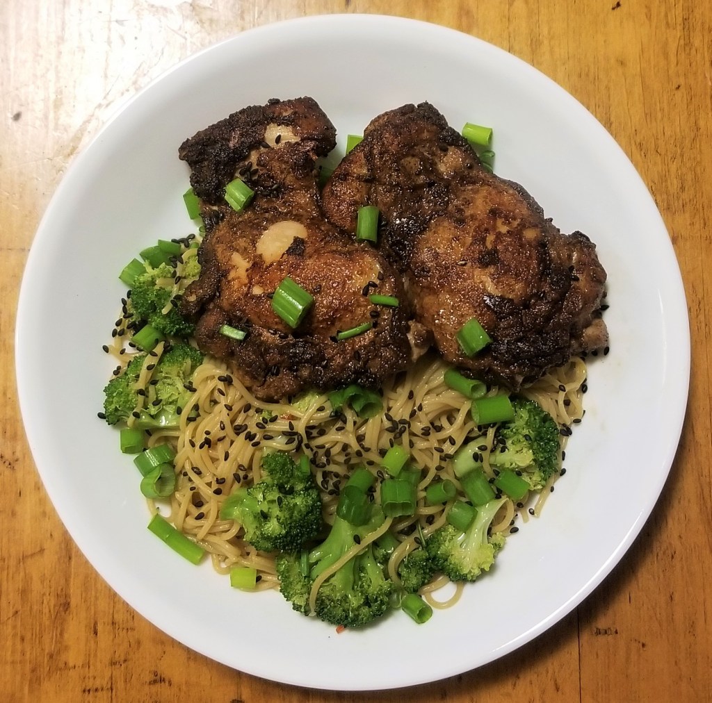 Coat chicken thighs in Chinese Five Spice. In a large skillet warm 1 Tbsp. vegetable oil. Sear chicken thighs for five minutes on each side, then cover and reduce heat and cook for an additional 3-5 minutes until chicken is cooked through.