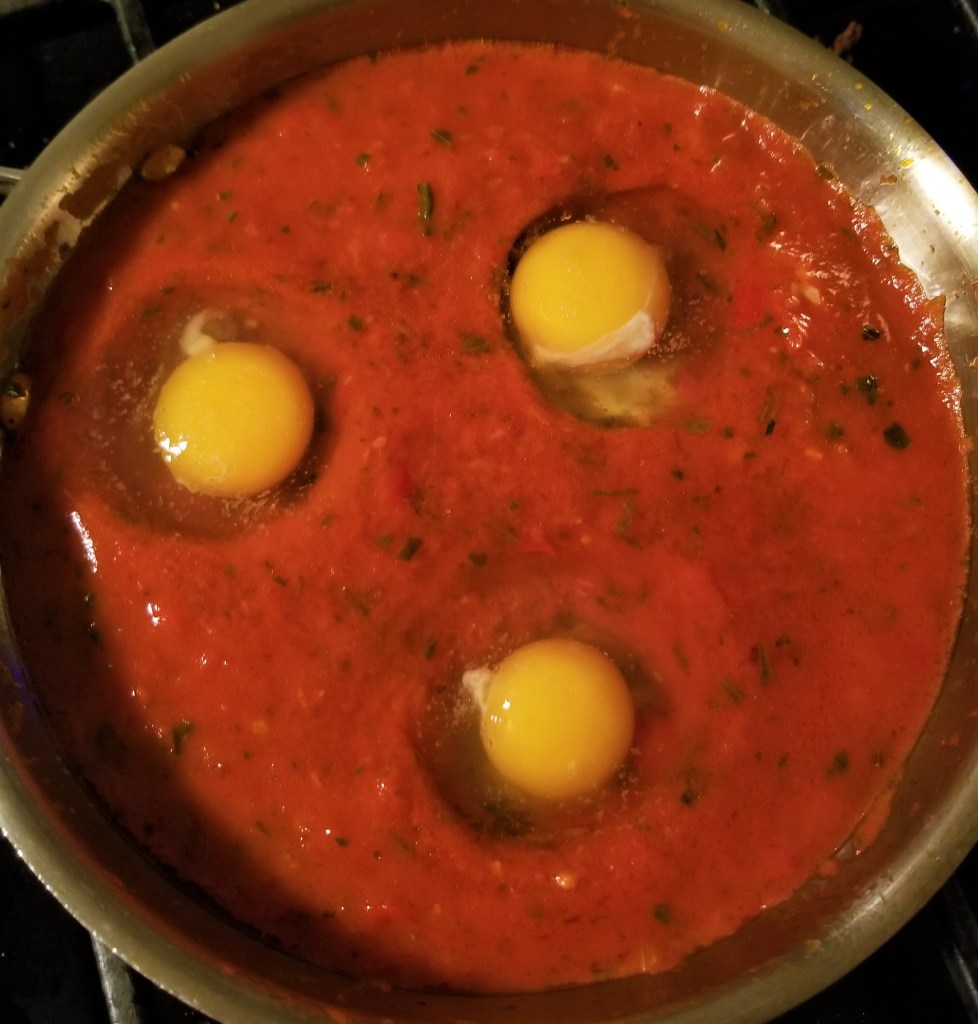 Preheat oven to 350. Heat olive oil in a small, oven safe skillet. Chop any fresh tomatoes you have and mince the garlic. Sauté tomatoes and garlic in olive oil until fragrant – two or three minutes. Pour in marinara sauce and stir to combine. Bring to a simmer and allow flavors to meld for two to three minutes. Remove from heat and crack eggs into the sauce. Lightly salt the top of each egg.