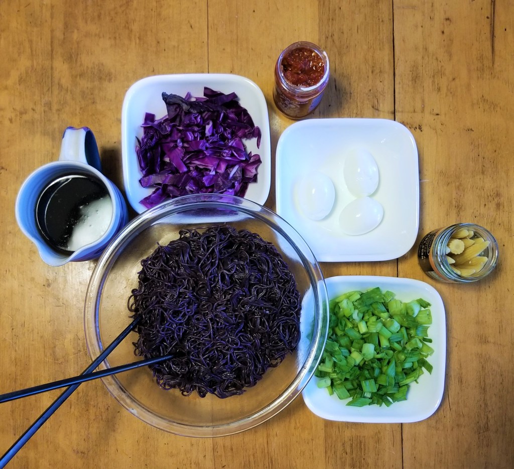 Boil the noodles to package directions. Drain and rinse with cold water. Drizzle one tablespoon sesame seed oil and toss so the noodles don’t stick together. Boil the eggs to your liking – I do a 6 minute egg so I end up with a jammy yolk. Let cool, then peel and set aside.