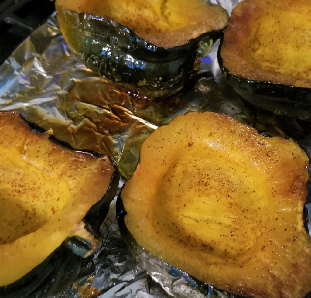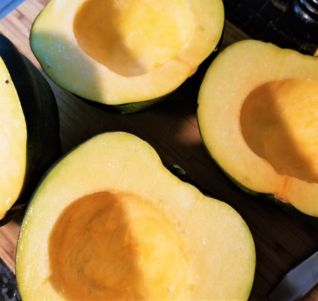 Preheat oven to 350 degrees. Cut acorn squash in half and scoop out the seeds and stringy bits. Drizzle with olive oil and season with Morton Season All. Place cut side down on a foil lined baking sheet and bake for one hour. Remove from oven and let cool. The squash should be fork tender.