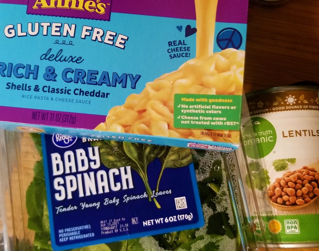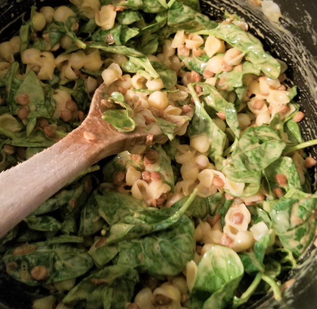Cook the macaroni of your choice to package directions. Drain one can of lentils and stir in just after you add the cheese, then add the spinach. I added a pinch of garlic salt as well. Mix everything together, then cover for 5 minutes so the spinach wilts.