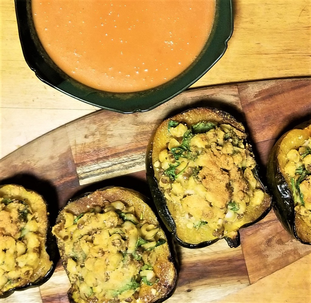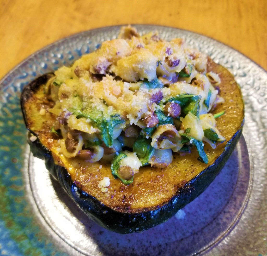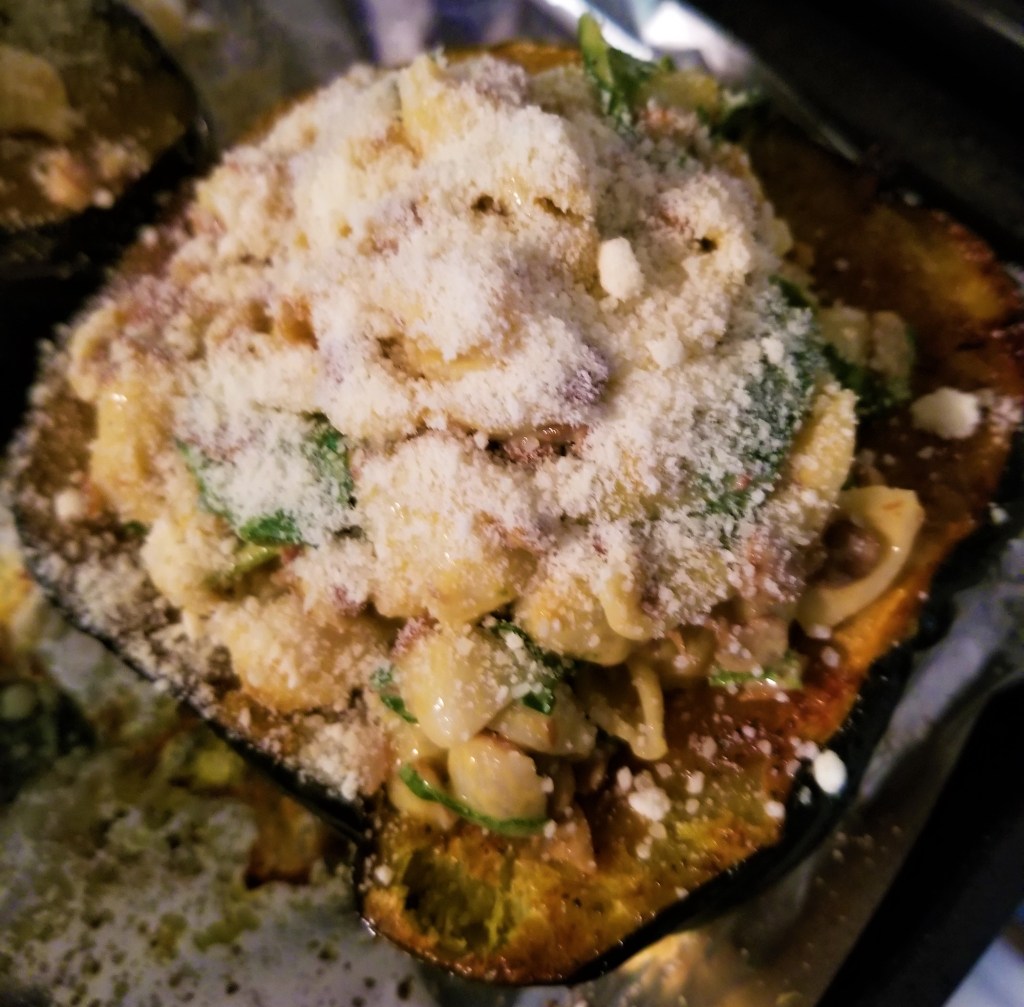 Spoon macaroni mixture into squash, piling high. Top with as much parmesan as your heart desires. Broil for 10 minutes until golden. Serve with tomato soup as a meal or alone as a heavy appetizer.