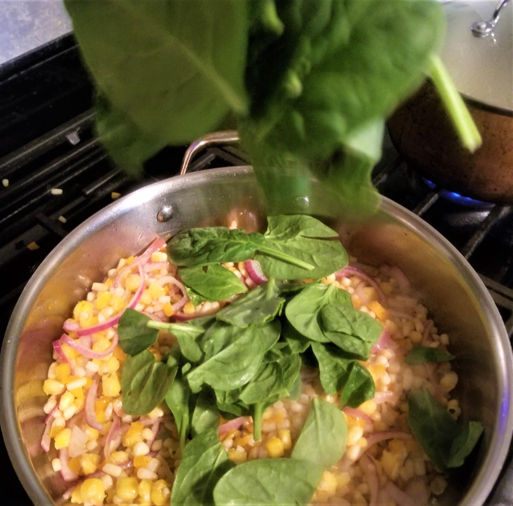 Stir the spinach around, incorporating it with the corn so it starts to wilt. Add in the garlic salt, cumin, and white pepper. Continue stirring for 5 minutes until the spinach is wilted and the seasonings are thoroughly spread about. Turn off heat and let cool. Meanwhile, boil the rice.