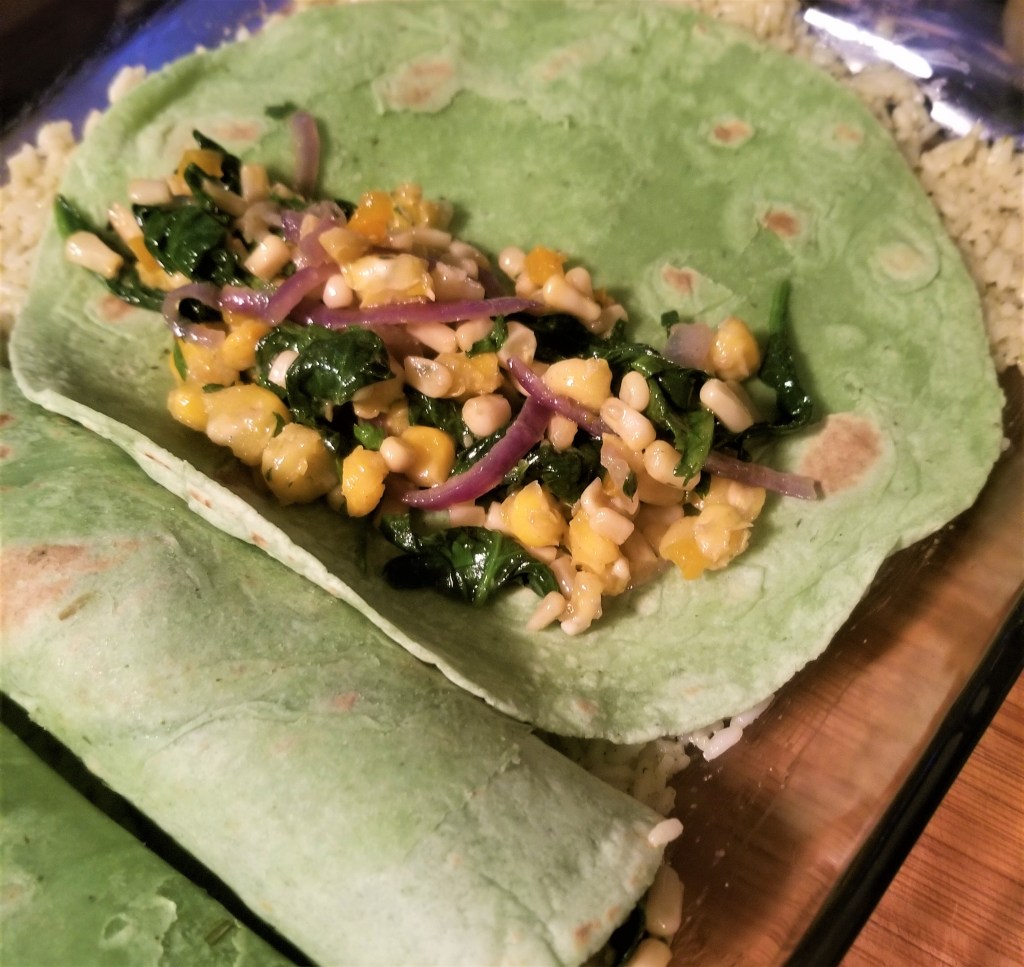 Once the rice is done cooking, spread it evenly over the bottom of a large casserole dish and let cool. Taking one tortilla at a time, fill with about 1/2 a cup of the corn and spinach mixture and roll, placing on top of the rice.