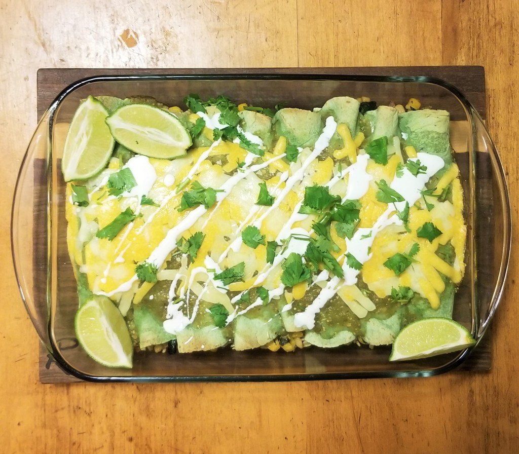Bake at 350 degrees for 30 minutes. Remove from oven and let cool for ten minutes, then drizzle with table cream, sprinkle with fresh cilantro and a squeeze of fresh lime.