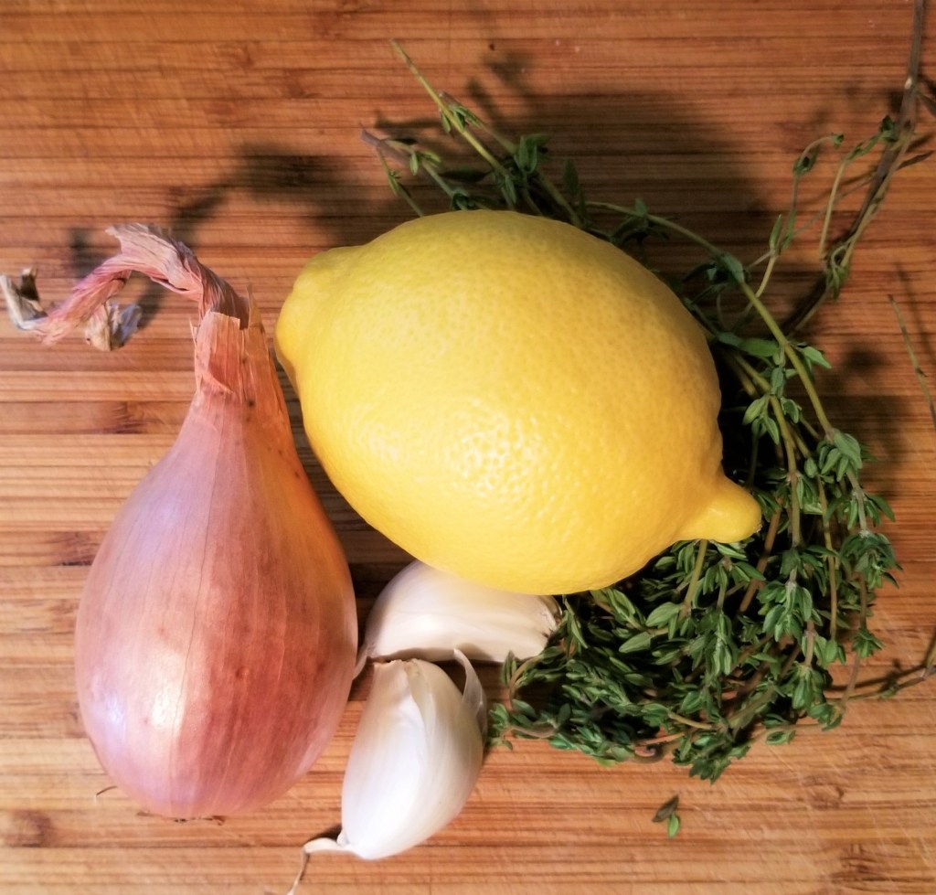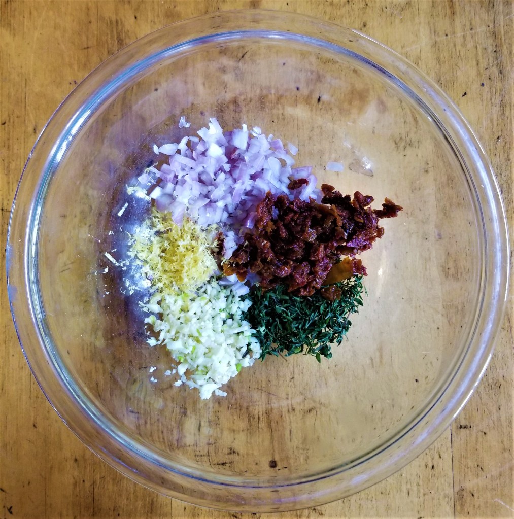 Chop sundried tomatoes, shallot, and garlic. Strip the leaves off the thyme. Zest and juice the lemon.