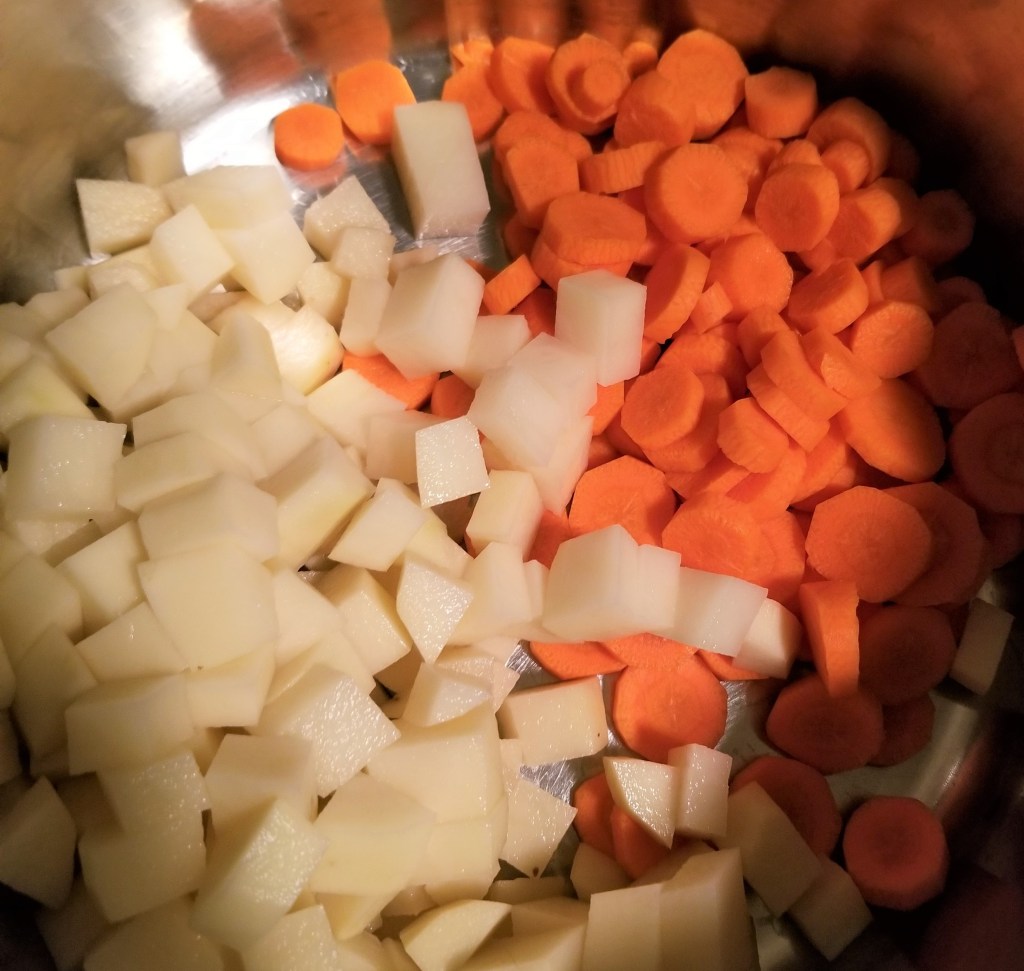 Peel and chop the potatoes and carrots and get them in a pot of water to boil for about 20 minutes. This will ensure they are cooked through in the pie. Chop and add the garlic to the pot along with the salt.