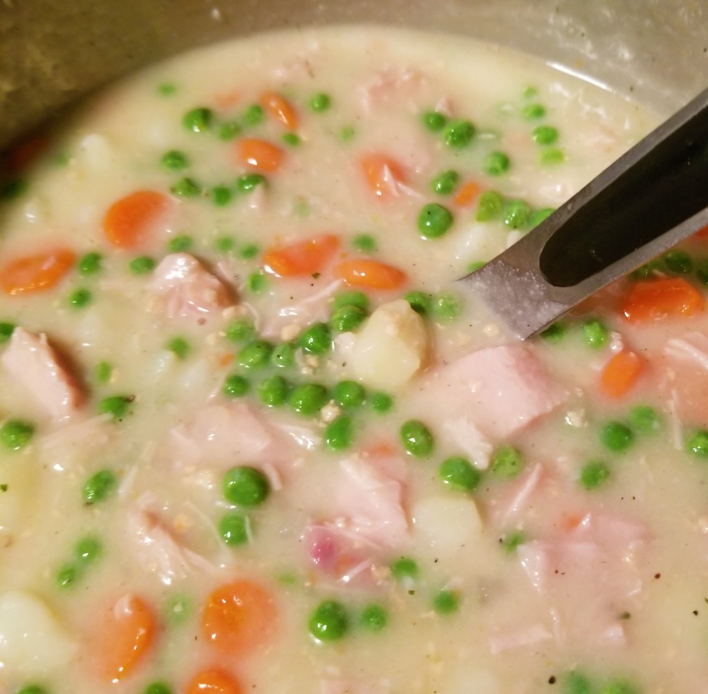 Combine the cream of chicken soup and chicken stock until smooth. Add the garlic salt and black pepper. Once the carrots and potatoes are at the beginning stages of fork tender, add in the turkey and allow to boil for an additional 5 minutes to incorporate the flavors.