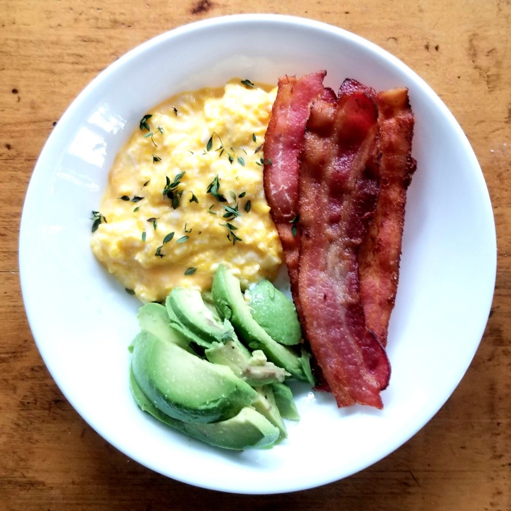 Take the eggs out of the fridge so they can warm up a bit – this is key to silky eggs. Fry the bacon to your preference and set aside. Slice the avocado and squeeze the lemon on top – this prevents browning, but also adds amazing flavor and freshness.