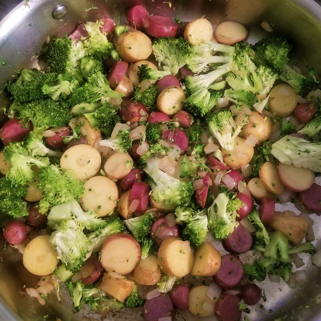 Wash and slice the fingerling potatoes, onion, and broccoli. (The fingerling potatoes I bought were delightfully pink, but any potato would work.) In a large skillet, heat the avocado oil and add the potatoes and onions. Cook down for about 10 minutes so the potatoes begin to soften. Sprinkle salt over the potatoes about halfway through. Add the broccoli and cooked bacon and continue cooking for another 5 minutes.