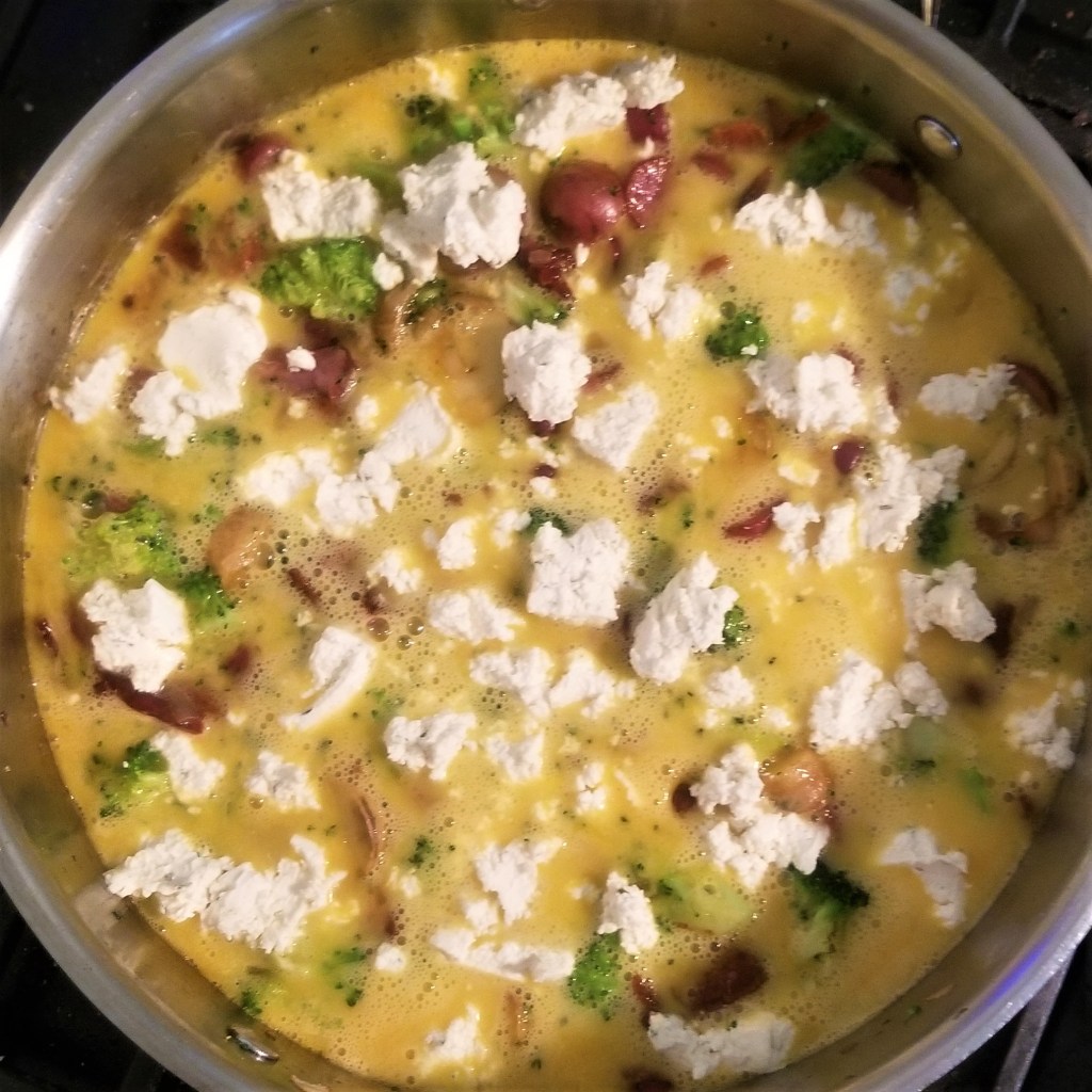 Whisk the eggs, garlic salt, and pepper until smooth and well incorporated. Turn the heat off and pour the eggs over the potato mixture. Spoon dollops of Boursin cheese evenly across the top.