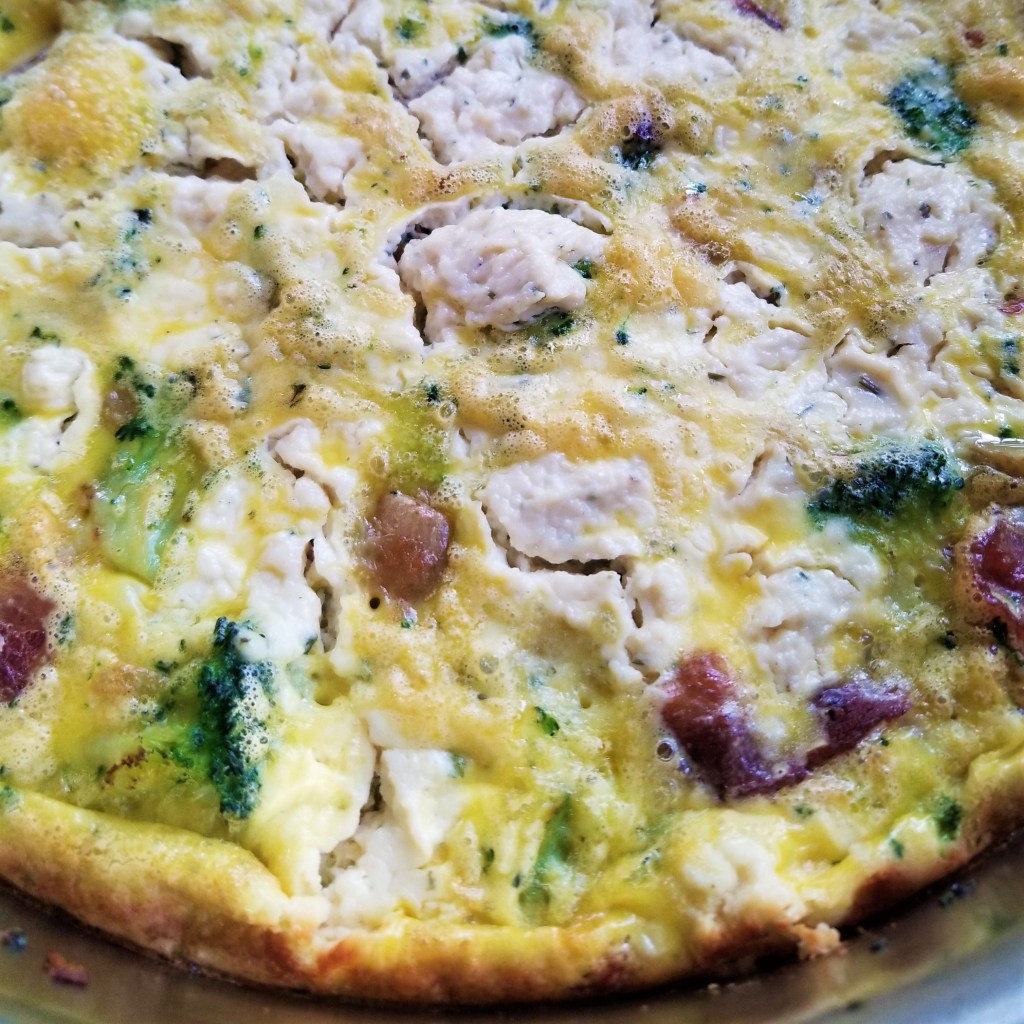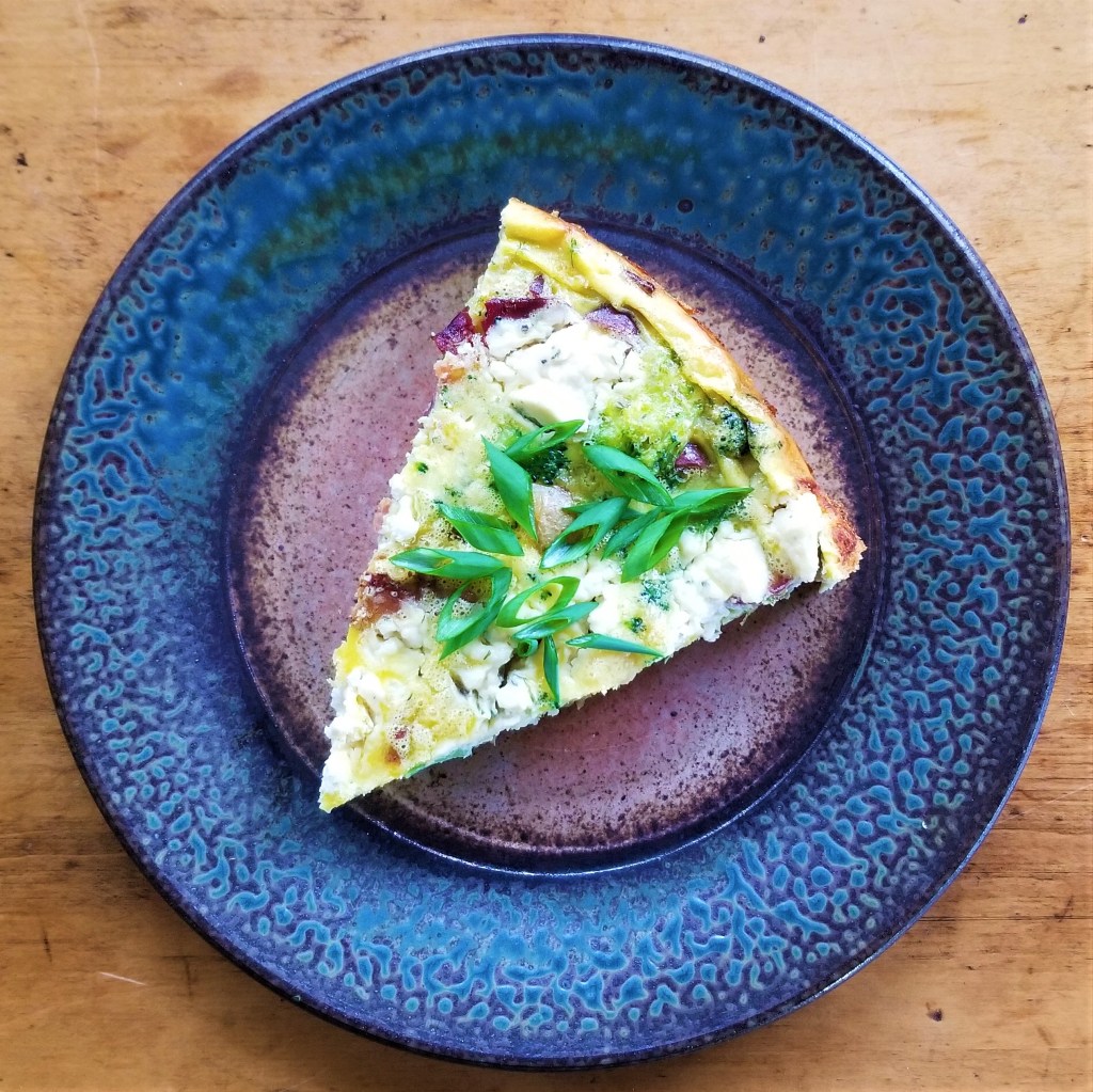Bake in a 350 degree oven for 30 minutes or until the eggs are set. Let cool for 5 minutes before slicing and serving. Garnish with green onions.