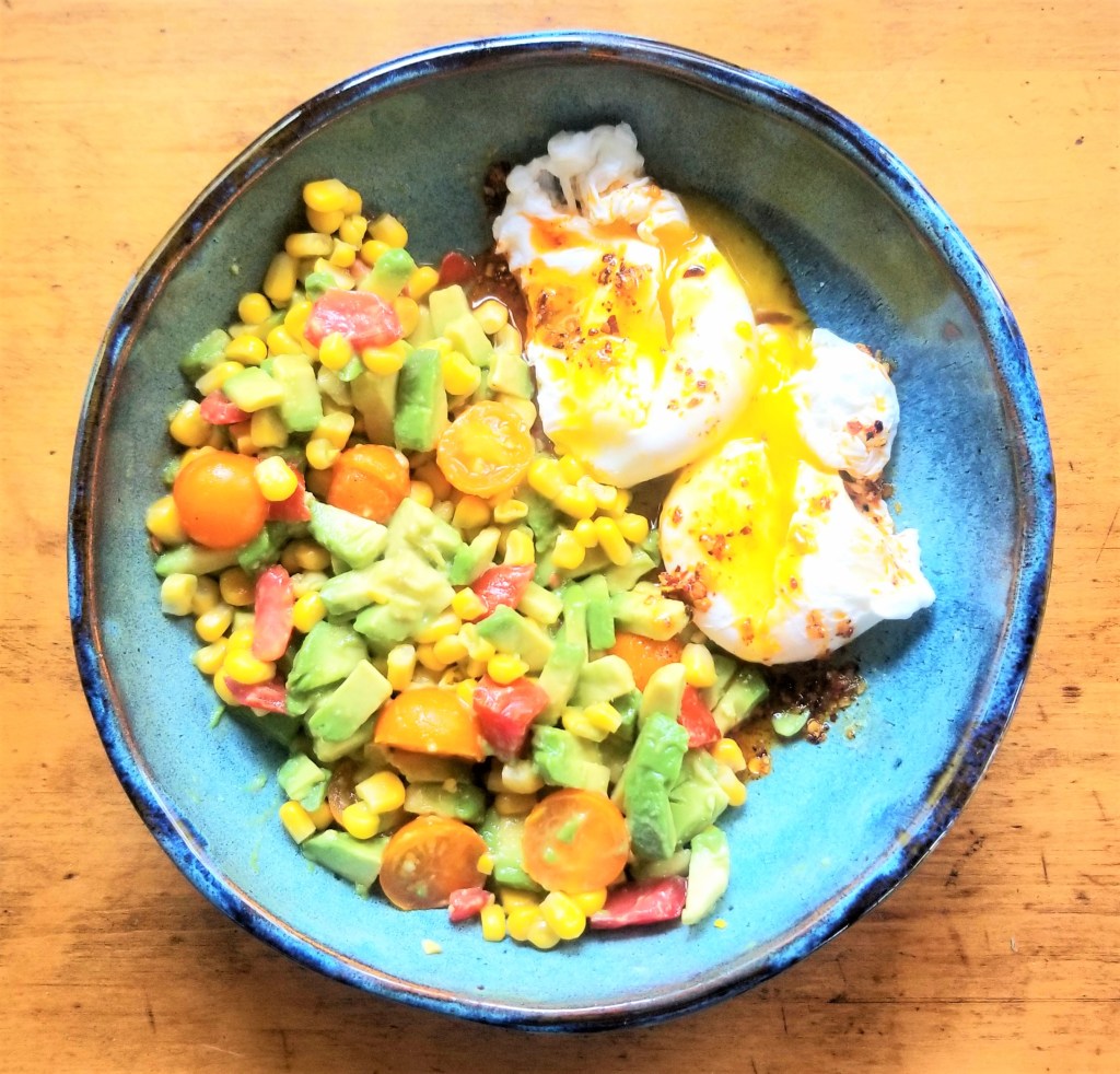Slice the avocado and cherry tomatoes into bite sized pieces. Combine with corn and salt to taste. (TAC = tomatoes, avocado, corn and it goes with everything!) Poach the eggs in water and vinegar. Plate with TAC salad, drizzle with chili crisp, and salt to taste.