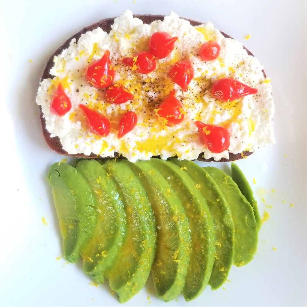 Toast the bread. Spread ricotta cheese evenly on top of the toast. Top with sweety drop peppers. You can usually find them in olive bars or jarred near the pickle section. Slice the avocado and fan onto a plate. Squeeze lemon juice over both the toast and the avocado. Lightly salt and pepper to taste.