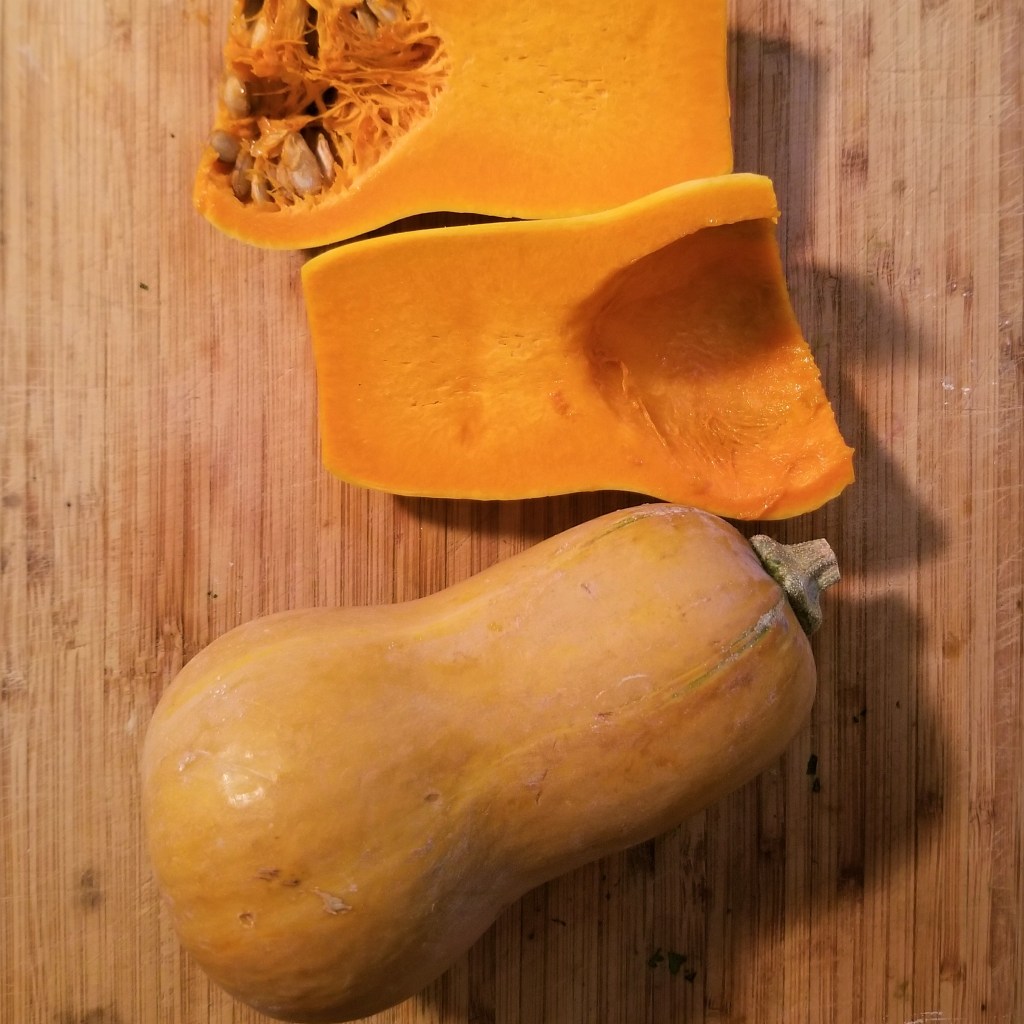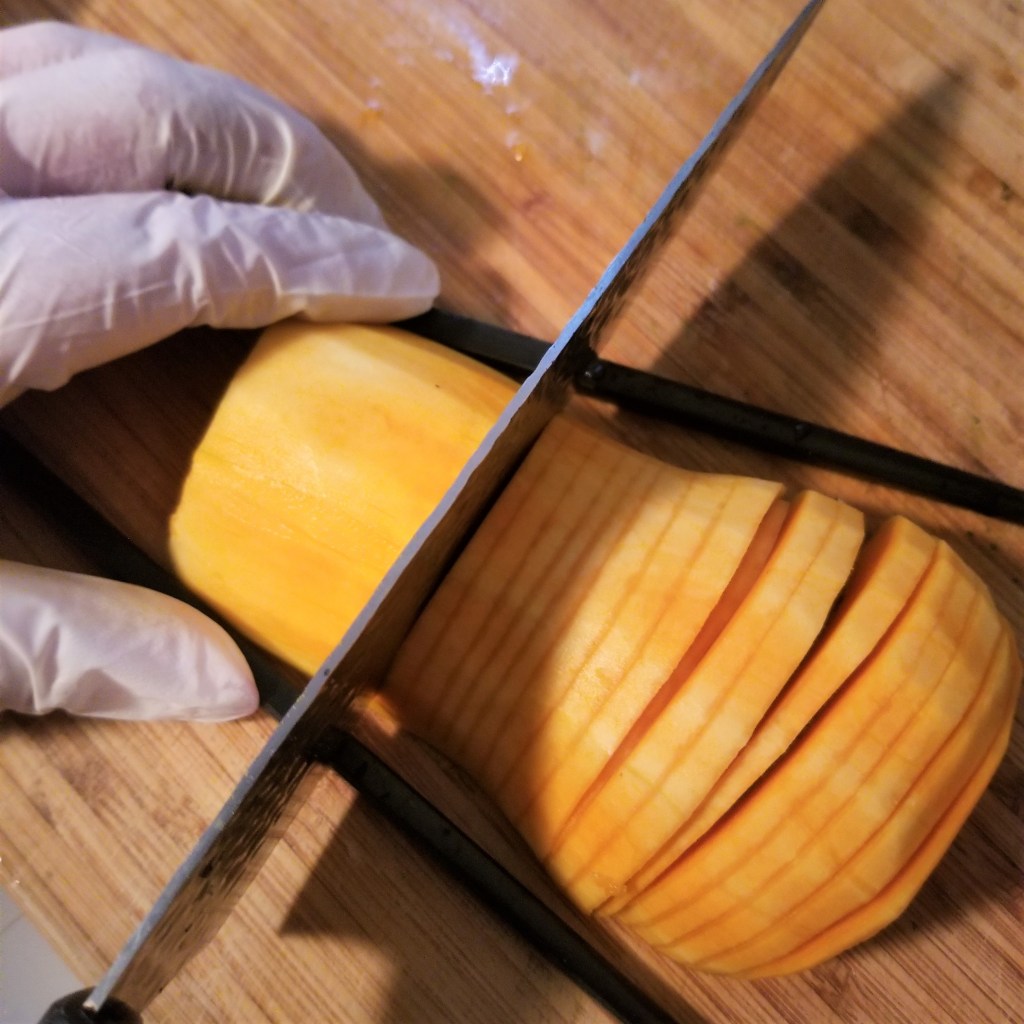 Peel the honey nut squash, trim ends off, cut in half, and scoop out strings and seeds. Using two chopsticks or skewers, cut them Hasselback. (You can’t do it without a guide…stop trying.)