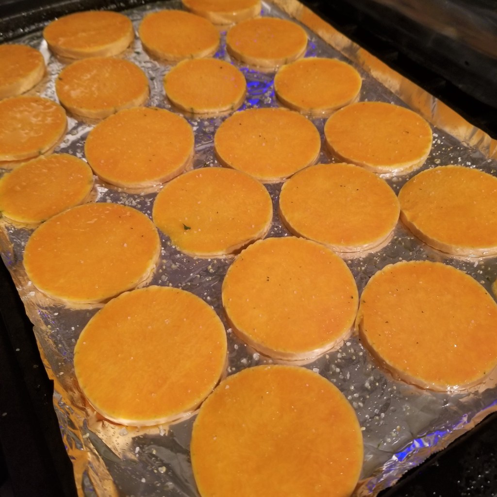 Slice thin rounds from the smaller end of the butternut squash. No need to peel the skin off, it’s edible! On an oiled and foiled baking sheet, place them evenly and sprinkle with salt. Bake at 350 for 20-30 minutes, flipping once. The timing will heavily depend on how thin or thick the slices are. You want them to be fork tender.