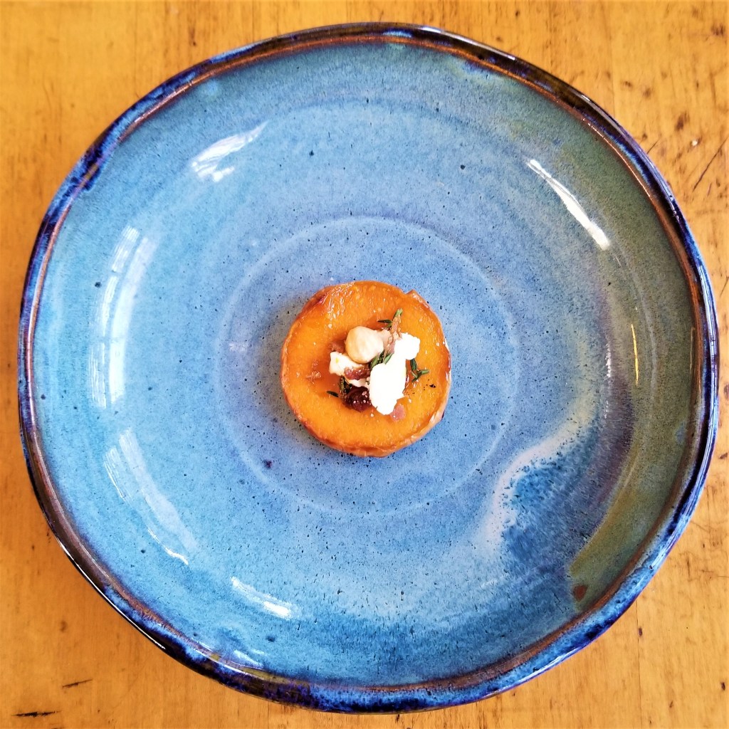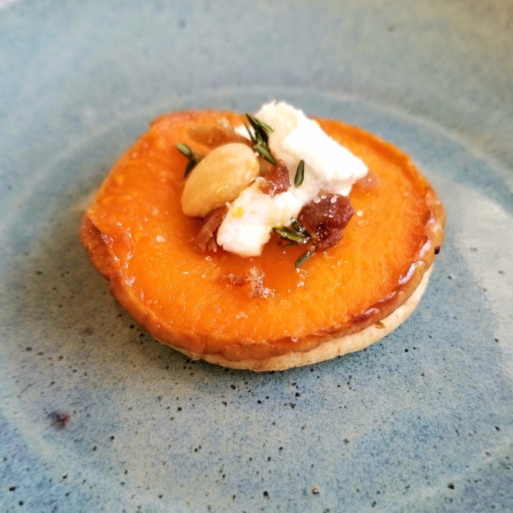 Cover your serving platter with crackers, then add a round of butternut squash on top of each. Spoon on a pinch of goat cheese, add a Marcona almond (a walnut or pecan would be delicious too), and a sprinkle of bacon. Top with a drizzle of hot honey, a tiny pinch of flaky salt, and fresh thyme.