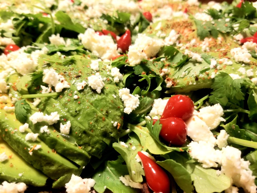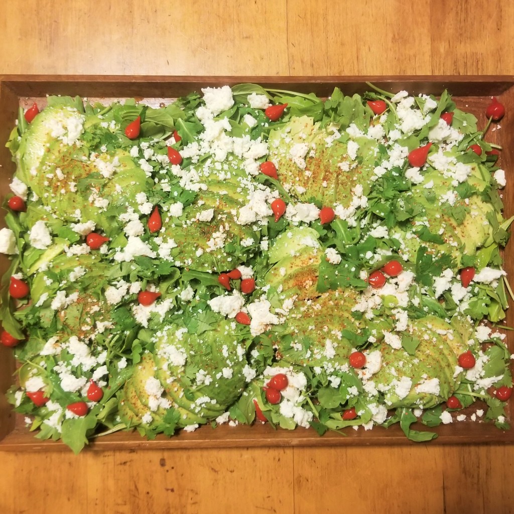 On a large platter spread the arugula into an even layer and sprinkle with salt and pepper. Slice the avocados in half, remove the seed, and peel the skin off. Slice into even sections and, using the back of your knife, press gently to fan out. Use a spatula to transfer each fanned out half onto the arugula. Squeeze lemon juice over the avocados to prevent browning.