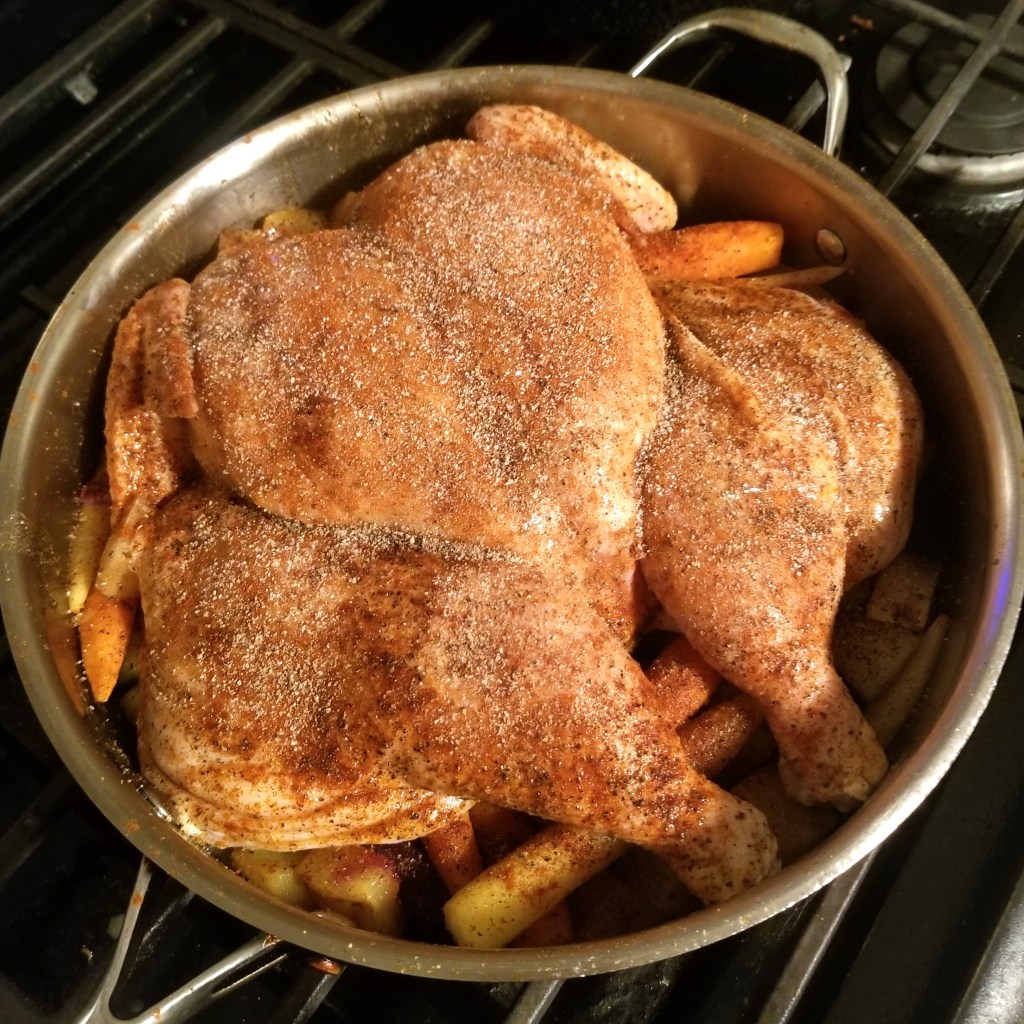 Place the chicken on top of the mostly cooked carrots and potatoes and brush on the paprika butter. Season heavily with salt and pepper, then place in a 350 degree oven for one hour or so. (The and so depends heavily on the size of your bird. Spatchcocking speeds up the roasting time, but only by 20 minutes or so. I normally roast a 6 pound bird for an hour and a half minimum.)