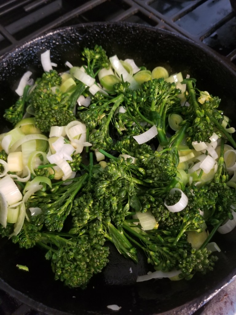 Preheat oven to 350 degrees. Wash and chop the broccolini, asparagus, and leeks. In a large cast iron skillet, warm the olive oil and toss in the broccolini and leeks. Cook on a low/medium heat so they start to soften, but not scorch.