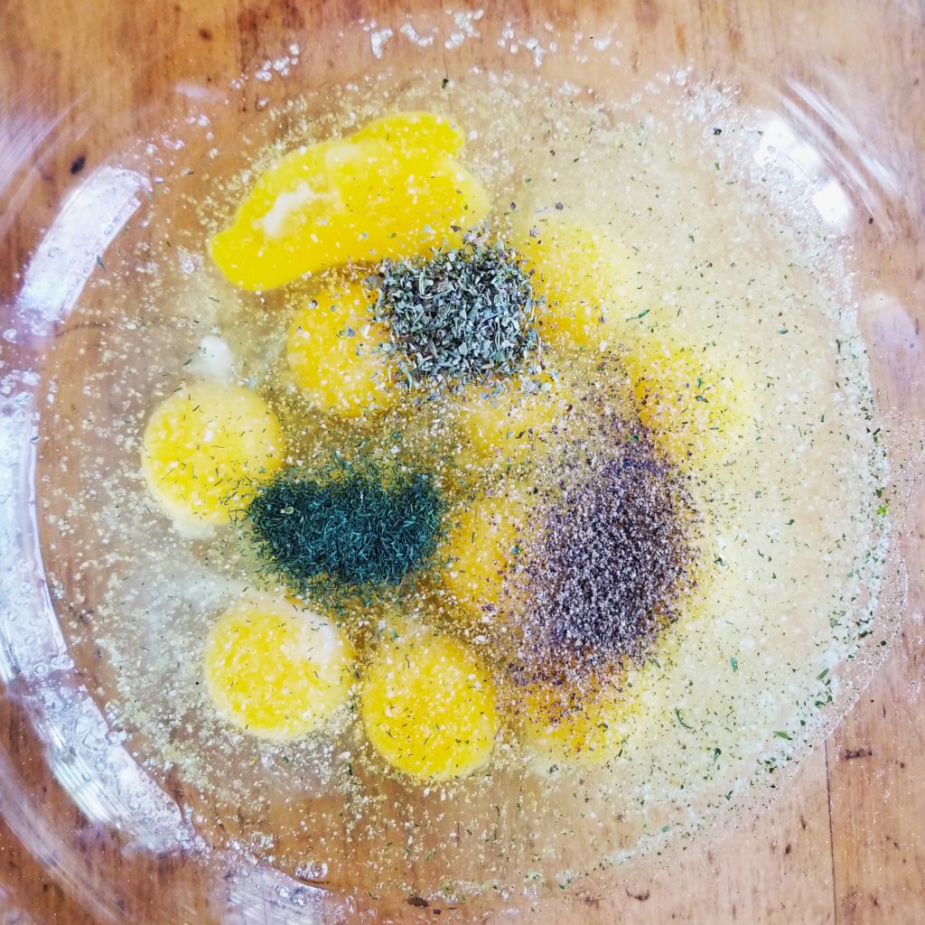 Whisk together eggs, dried herbs, and Nature’s Seasons.