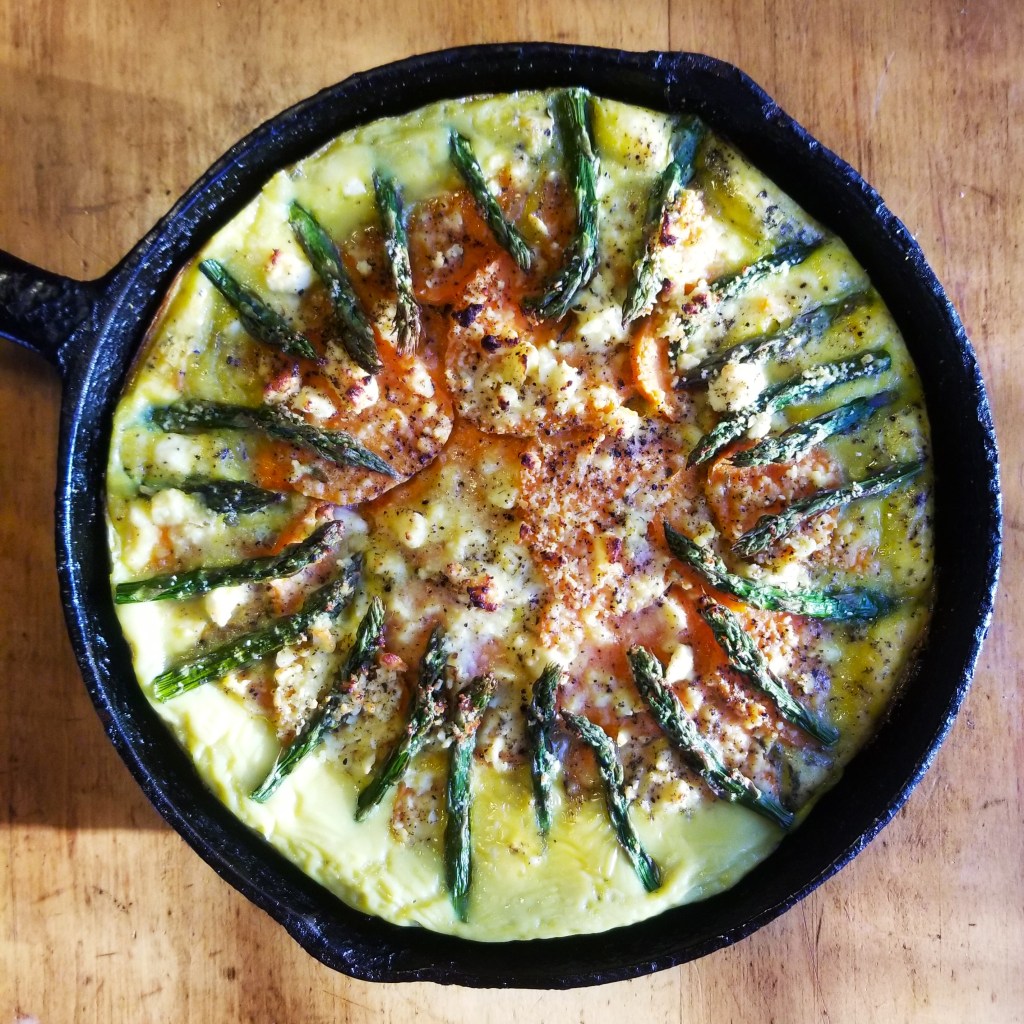 Pour whisked eggs over the vegetable mixture and let sit on medium heat for 2-3 minutes. don’t stir! You’ll mess up your layers! Place asparagus spears in a circle around the edge of the frittata. Sprinkle with any remaining feta and the parmesan.