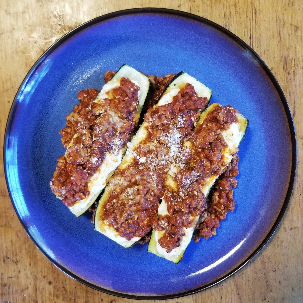 For the filling, combine ricotta, parmesan, and more Nature’s Seasons. Let the zucchinis cool for a few minutes before filling, starting with a generous layer of the ricotta mixture.